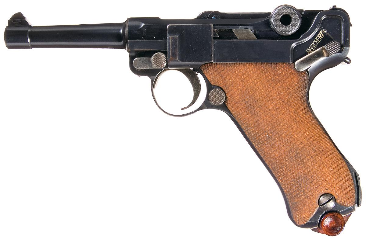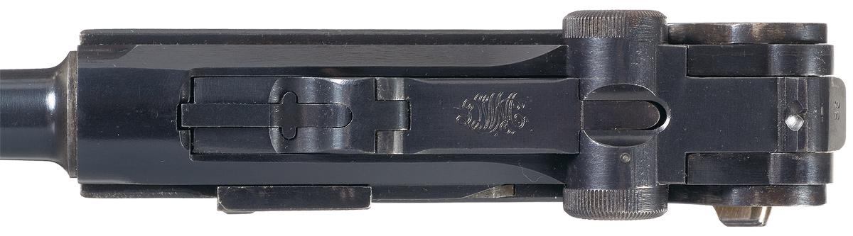 Fixed sights, with the blank chamber and "DWM" monogram on the toggle. "Crown/N" proofs on the left side of the barrel extension, underside of the barrel, and left side of the breechblock. Matching numbers on the barrel and frame, with the last two digits on the latch, side plate, trigger, and toggle links. Straw finished small parts, checkered hardwood grips and a wood base replacement Swiss 06/24 magazine.