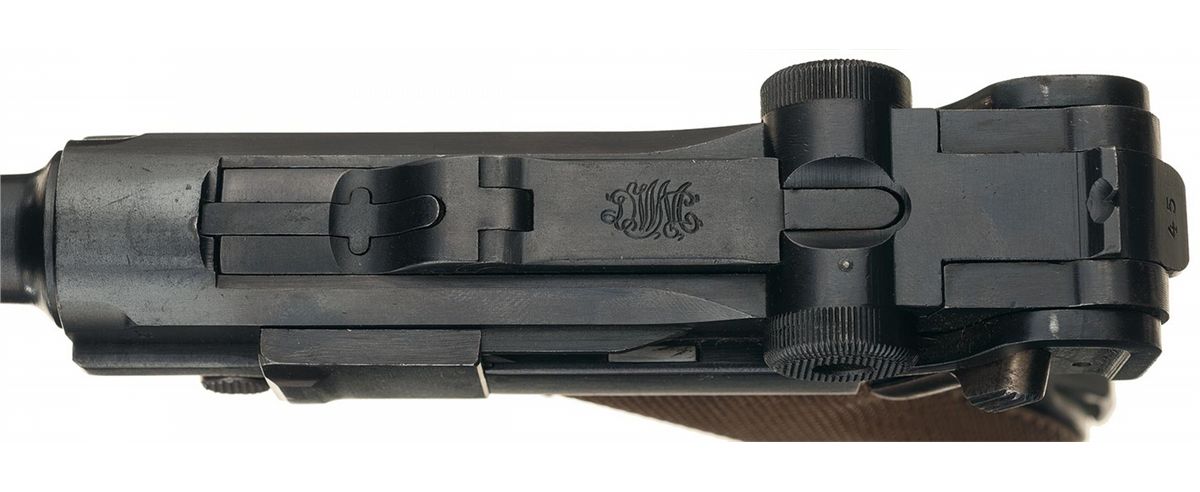 The top of the chamber is blank, the toggle has the "DWM" monogram, "crown/N" proof on the left side of the barrel extension and breechblock, and the serial number is marked on the front of the frame with "GERMANY" between the number and letter suffix. The partial serial number "45" is marked on the takedown lever, side plate and rear toggle. Straw colored small parts, stock lug, nickel magazine with unmarked wooden base and fitted with checkered walnut grips.