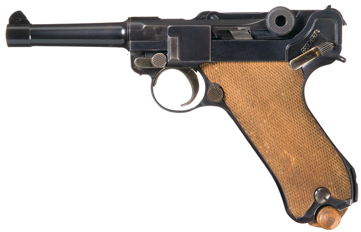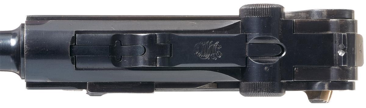 Fixed sights, with the blank chamber and "DWM" monogram on the toggle. "Crown/N" proofs on the left side of the barrel extension, underside of the barrel, and left side of the breechblock. Matching numbers on the barrel and frame, with the last two digits on the latch, side plate, trigger and rear toggle. Straw finished small parts, checkered hardwood grips and a wood base magazine.