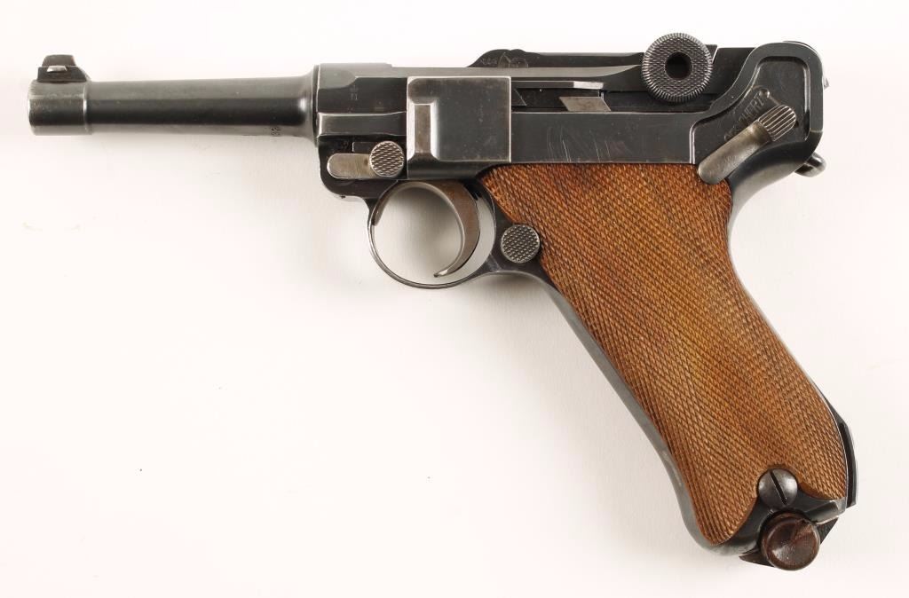 'Commercial' German made semi-automatic hammerless pistol chambered in .30 Luger, circa 1920's. Features a blued finish, 3 7/8" nitro proofed barrel, fixed sights, stock lug, later period checked wood grips, period magazine with ill-matching serial number - all other serial numbers matching, wide smooth trigger and thumb safety. Finish retains 85% of original bluing with high edge wear. Markings are crisp. Action is strong, bore is excellent and grips are fine. Condition is very good++. ***C&R Firearm*** ***Modern Firearm***