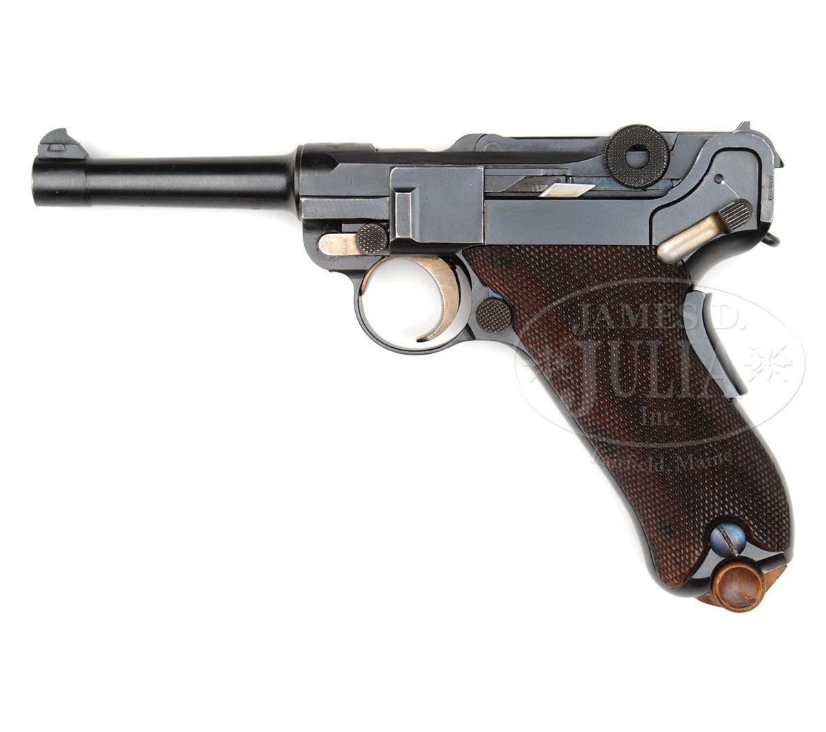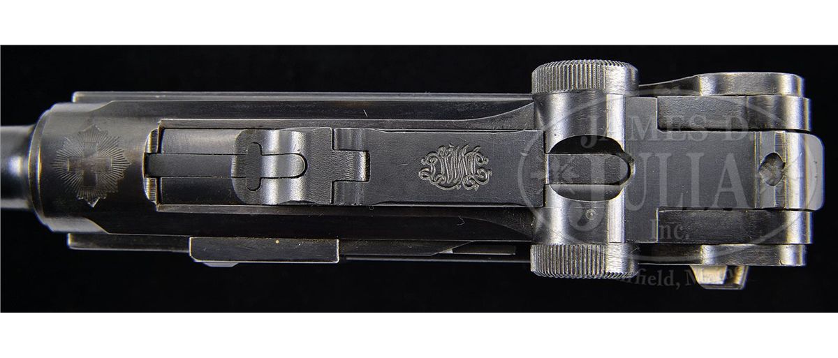SN 2343i. 4" 30 Cal. bbl. Swiss cross in sunburst above chamber. "DWM" scroll on center toggle link. Grip safety. i suffix four digit serial range. Crown/N proofed. Checkered walnut grips. "GERMANY" marked very small on left side of back frame rail behind safety lever. "GERMANY" marked wood bottom magazine. All numbered parts are matching, except for the grips which are #55 and the holdopen which is #60. This gun is featured on pp. 608 and 610 of Dr. Geoffrey Sturgess' The Borchardt & Luger Automatic Pistols. PROVENANCE: Collection of Dr. Geoffrey Sturgess. CONDITION: Retains 98% orig blue and 95% orig straw. Bore is shiny and sharp. Grips are very lightly worn with one minor indent on the left grip. Magazine is excellent with light corrosion on the body and wood bottom that is near mint. Mechanics are excellent. 4-52782 BWS82