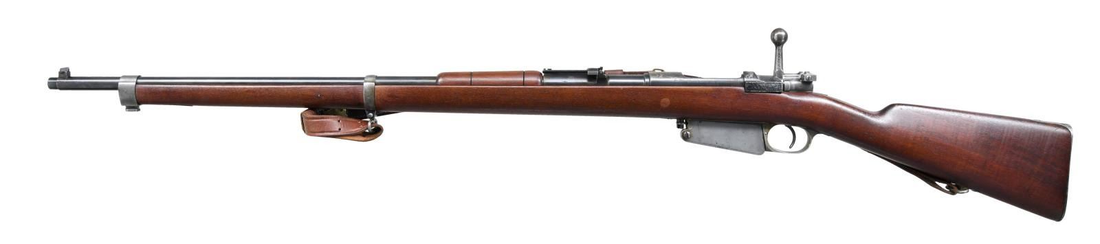 Cal. 7.65 Arg. S# W3037. Bbl. 29". All visible numbers matching. Later DWM mfg. example. Argentine crest ground off receiver. Ladder rear sight graduated to 2000m. Blade front sight. Walnut stock set w/ bottom mounted sling swivels & commercial leather sling. No cleaning rod present. UNATTACHED ACCESSORIES: 1891 Argentine bayonet numbered G8642 w/ matching scabbard & ground crest in good condition. CONDITION: sanded stock set shows a few dings & handling marks. Bottom metal & part of receiver have been cleaned giving them a silvery/gray appearance w/ some light dings & light oxidation. Band hardware is a smoky gray patina w/ light oxidation. Bbl. retains 60% arsenal blue w/ a few spots of light pitting & overall fading. Very good bore w/ some light oxidation. (23-2491/MJC). CURIO. $300-500.