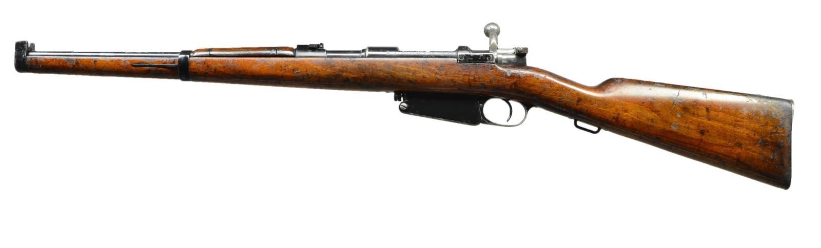 Cal. 7.65.x53 Argentine. S #C1590. Bbl. 17 3/4". Stock & rear sight mismatched but other visible numbers are matching Left side rail marked "MAUSER MODELO ARGENTINO 1891" and with DWM address. Receiver ring marked w/ faint Argentine crest. Bent bolt handle. Rear sight graduated to 1400m. Inverted V-front sight w/ protectors. Saddle bar on bottom of wrist. Mag. has retaining screw. Walnut stock w/ Argentine cartouche on right side of butt. CONDITION: refinished walnut stock set has added varnish, repaired crack on handguard, 1" crack behind upper tang, scattered flaking, dings & handling marks. Metal retains 70% of a black paint finish w/ scattered flaking & oxidation on buttplate. Fair bore showing some frosting & light pitting. (22-2462/MJC). CURIO. $400-600.