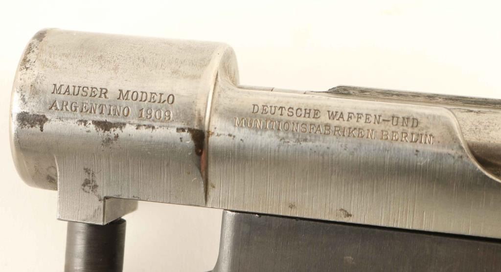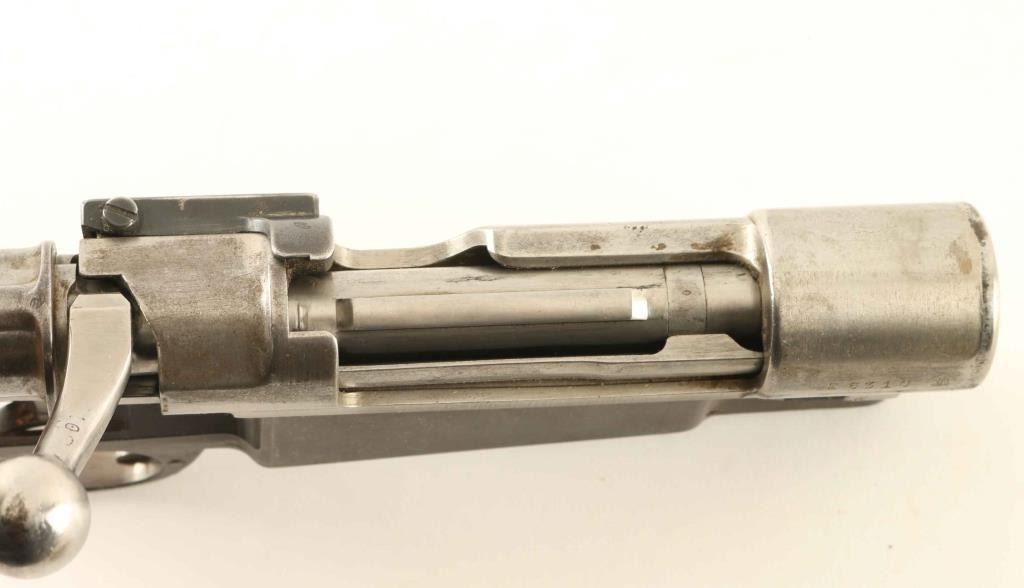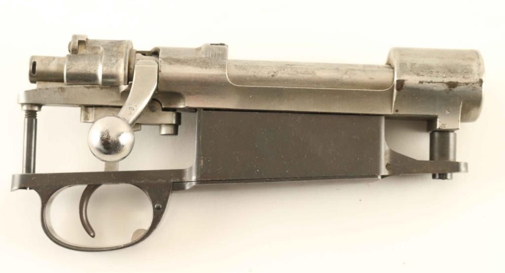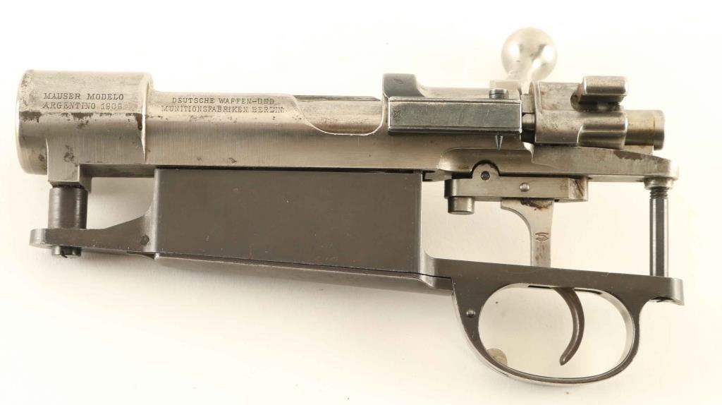 Complete large ring Mauser action with hinged floorplate bottom metal. Removed from a German made Mauser rifle built for Argentina. Bolt handle has been swept to help clear a scope. Receiver and bolt assembly in the white; bottom metal blued with bare metal showing where polished at trigger guard. Some patina and few tiny pits visible on receiver ring at stock line. No crest on receiver ring. Number on bottom metal matches serial number. Condition is NRA Very Good - action only ***C&R Firearm***