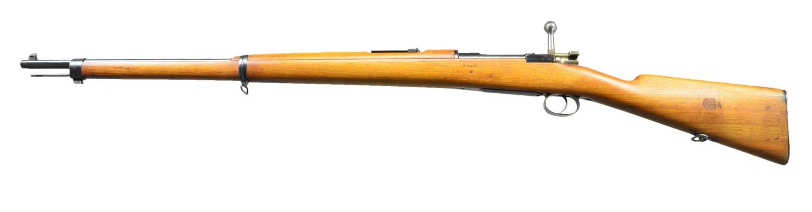 Cal. 7mm Mauser. S# M1841. Bolt is mismatched, all other S #'s matching. Top of receiver marked w/ Chilean crest. Left side rifle marked w/ "MAUSER CHILEANO MODEOLO 1895" and DWM marking. Early rear sight w/ single slider and graduated to 2000 meters. Inverted V-rear sight. Matching numbered cleaning rod present. Walnut stock w/ 1902 dated cartouche on left side of butt. UNATTACHED ACCESSORIES: Chilean 1895 bayonet & scabbard. Bayonet is numbered "A1830" and maker marked by Weyersberg Kirschbaum. Bayonet also has Chilean crest. Metal parts of bayonet dulling to gray patina with scattered oxidation and dried grease. Grip panels show scattered handling wear, dings and light chips. Scabbard is numbered "B2864" and shows scattered silvering, wear and light oxidation. CONDITION: walnut stock shows minor dings and handling marks. Metal retains 90% original blue w/ some wear on buttplate, front band keeper and handling marks. Bolt release, follower and rear band keeper show strong amounts of fire blue. Very good bore w/ dried cosmoline. (22-2507/MJC). CURIO. $300-500.