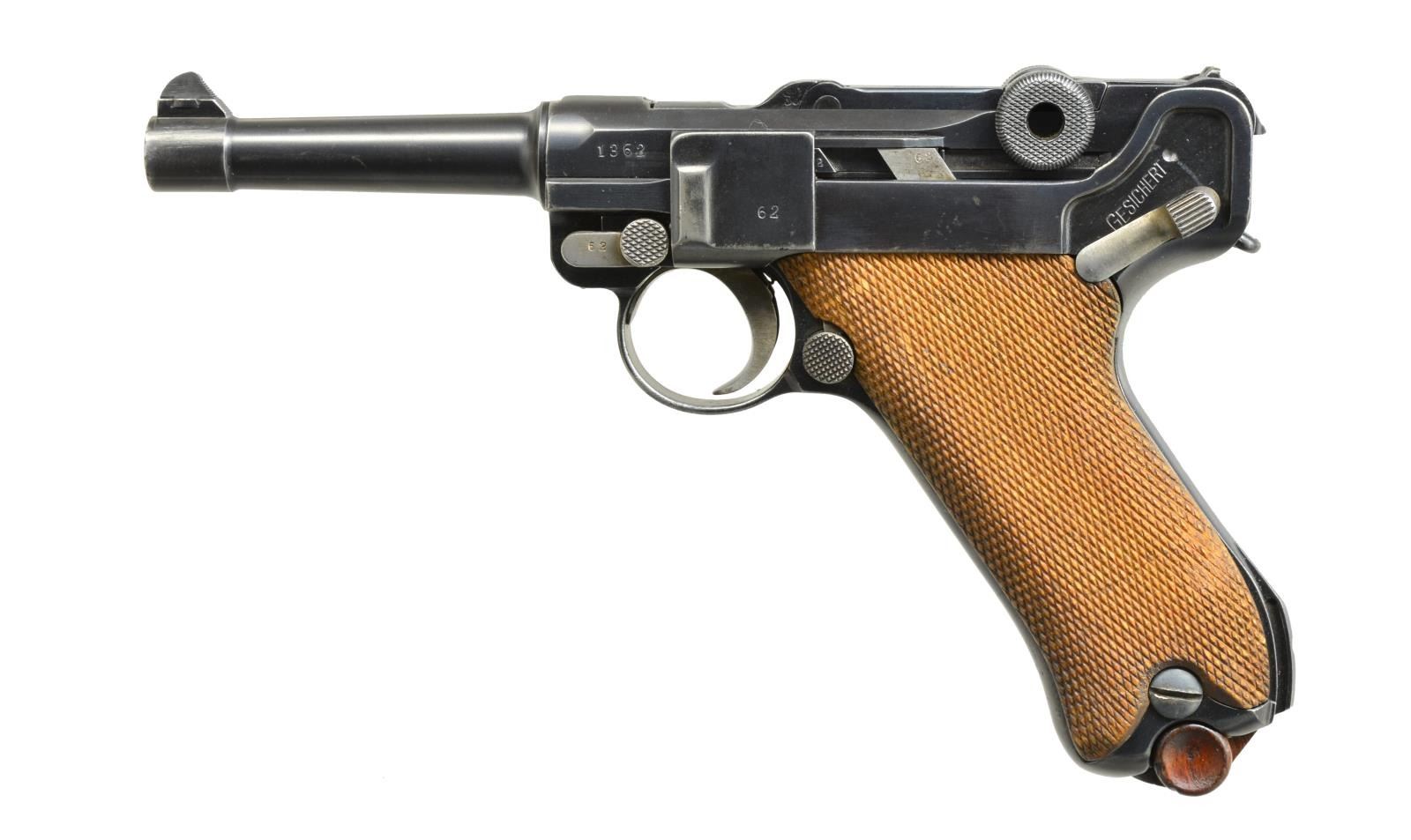 Cal. 30 Luger. S# 1362b. Bbl. 3 7/8”. Approx. 25,000 mfg. originally in 9mm Luger. Rebarreled to 30 Luger w/out markings on bbl. but w/ matching flats cut on top rear of bbl. & front of receiver; no matching chisel mark on bottom. Created for commercial foreign sales as indicated by “GERMANY” export mark under frame S#. Most metal parts including receiver matching numbered “62” in military positions. Firing pin numbered “80” plus left grip numbered “21”; right blank. Void of proofs. Appropriate strawed parts. MAGS: 1 good tin plated 8 rd. w/ plain wood base. Fails to function hold open latch; another mag. does. CONDITION: very good overall appearance w/ German quality refinish. 2 Faint impact marks on top of left receiver ear. Sm. chip on rim of rear toggle pivot. Good plus grips w/ light hand wear & some damaged diamond tops on left. Very light high point wear & near excellent bore. (20-3355/NW). CURIO. $800-1,200.