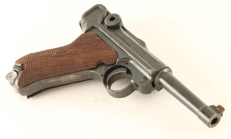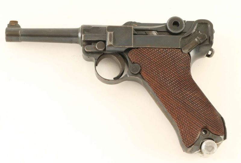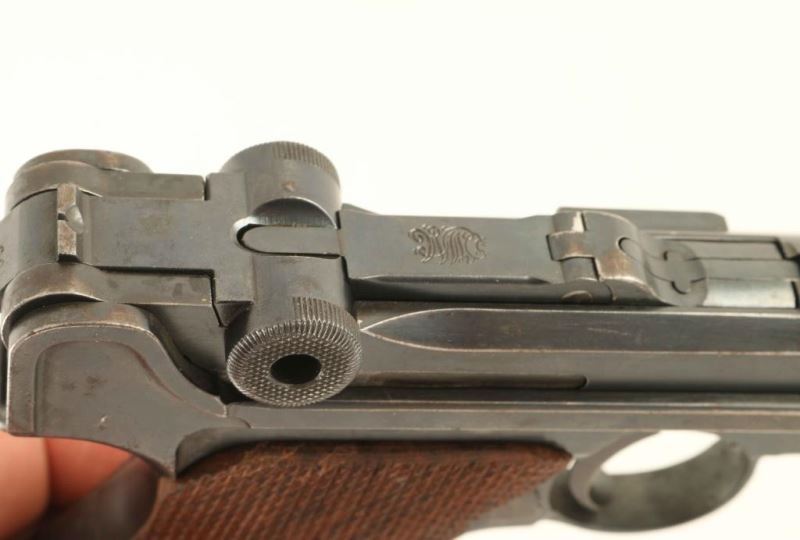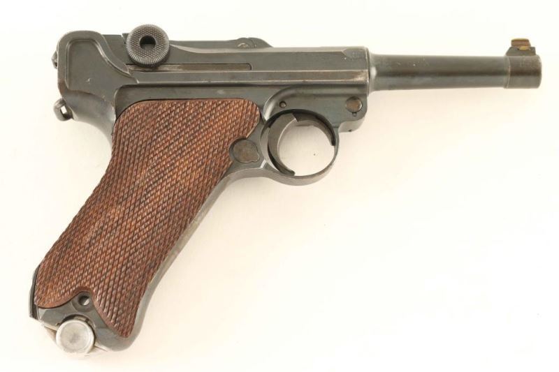 German made toggle locked recoil operated semi-automatic pistol chambered in .30 Luger. Features a blued finish, 3 7/8" barrel, dovetailed brass blade front sight with bead top, 'v' notched rear sight, smooth crescent trigger, knurled charging knobs on the rear toggle link, manual safety of the left side of the frame, push button magazine release, Haenel 8 round magazine marked "SCMEISSER PANENT" with aluminum base, lanyard loop, stock lug and two-piece finely checkered wood grips missing both screws. Matching serial numbers on the frame, barrel, take-down lever and rear toggle link. Markings: The frame is stamped "GERMANY," the toggle is stamped with the DWM monogram and the barrel, barrel extension and bolt are nitro proofed. Pistol exhibits approximately 70% of it's finely blued refinish showing wear and a small amount of light scattered surface rust. Action is strong, the bore is very good and the aftermarket wood grips are fine. Condition is NRA Good. ***C&R Firearm***