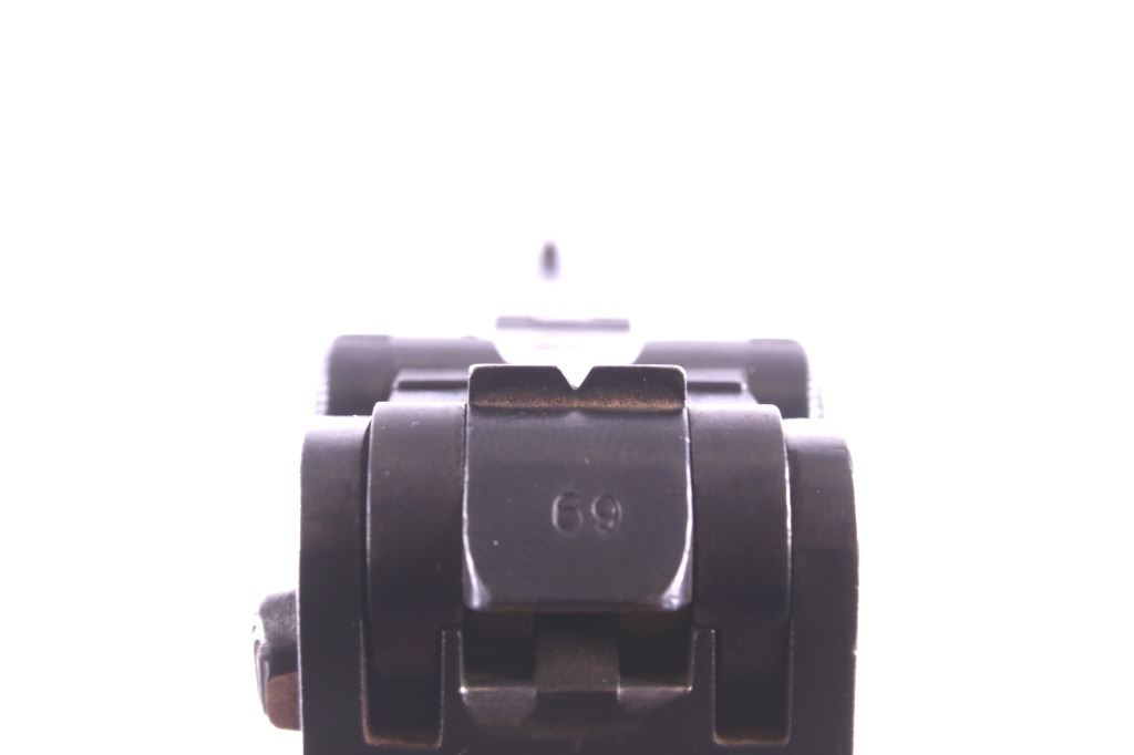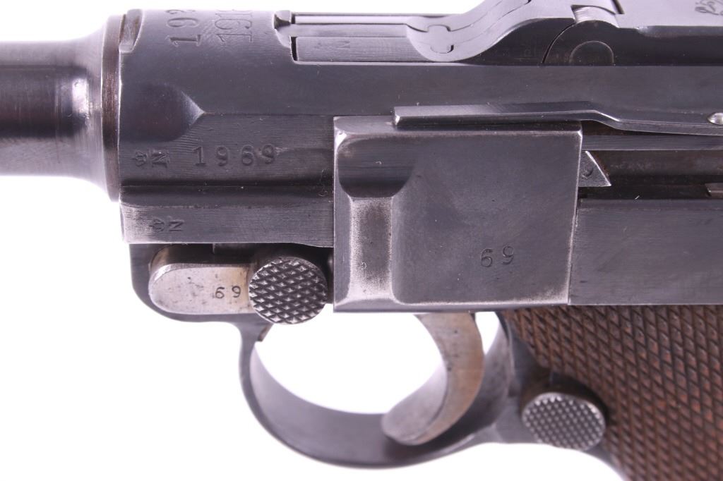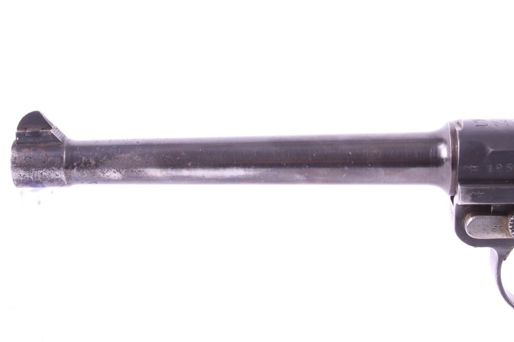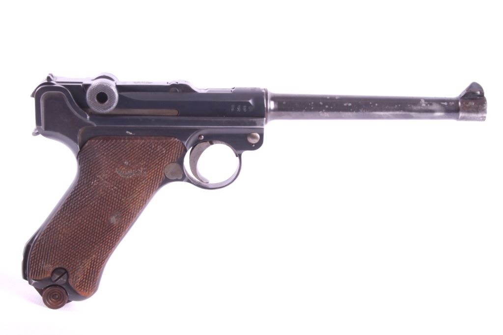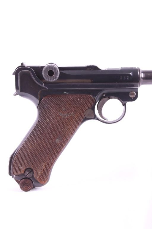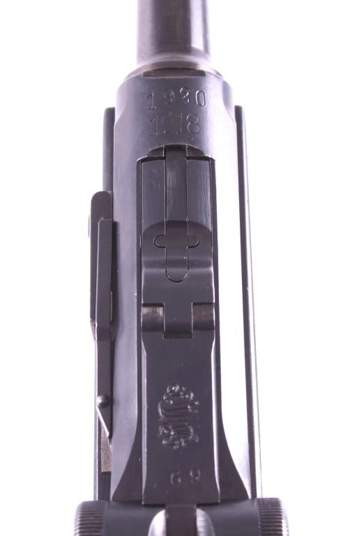 DWM marked and double dated German Luger with rare 5 7/8” barrel in 7.65 Luger caliber (.30 Luger). This was a scarce commercial model clearly stamped with its year of manufacture 1918. It is further stamped 1920 indicating it was a post World War I German government buy-back from civilian ownership. This was the first step in disarming the German population which at the time held an enormous amount of arms from the recently ended war. All such buy-back arms were stamped with the 1920 date. Many were then re-issued by the government to the police, navy and other agencies. This is a wonderful condition example with all metal parts having the matching last two digits of the full serial number 1969. Additionally, it retains all the proof marks including the “crown N’ firing proof, other proofs and “DWM” marking (Deutsche Waffen und Munitionsfabriken). This example also retains a beautiful blue finish, original sights and lovely correct and desirable “straw” coloring on the trigger and safety lever. It has finely checkered walnut grips and wood-bottom magazine. It is in mechanically excellent condition with a bright, sharp bore. A wonderful matching example full of history! This pistol qualifies as a Curio & Relic hand gun, and requires FFL Transfer or NICS Background Check. Serial Number: 1969