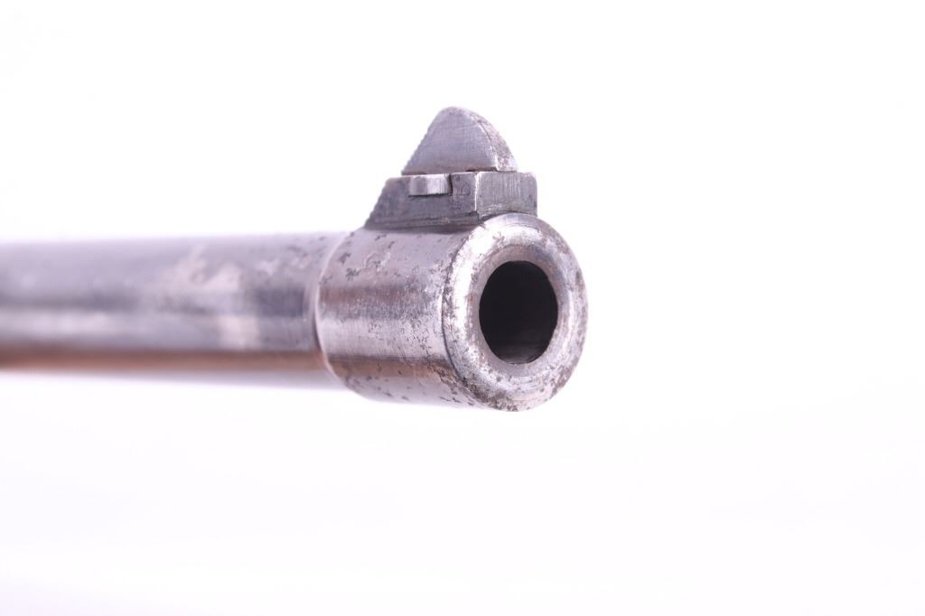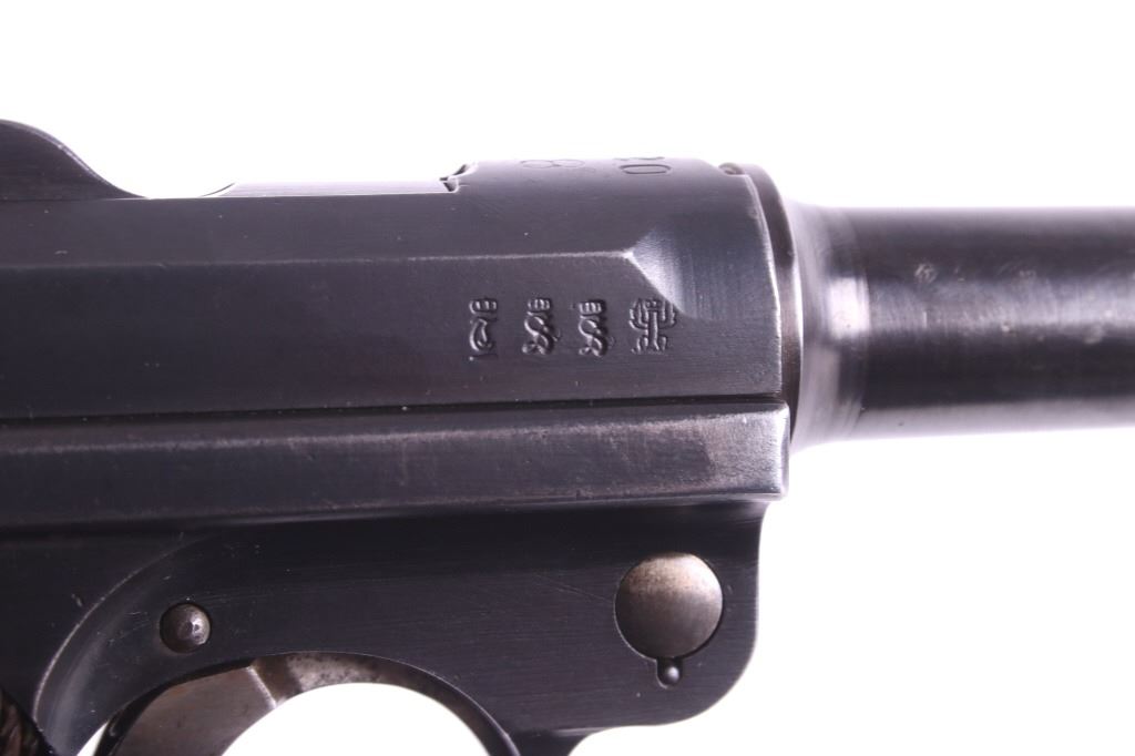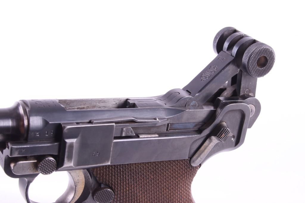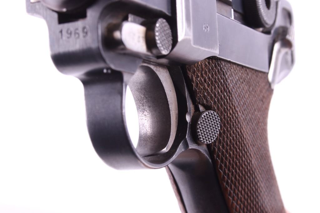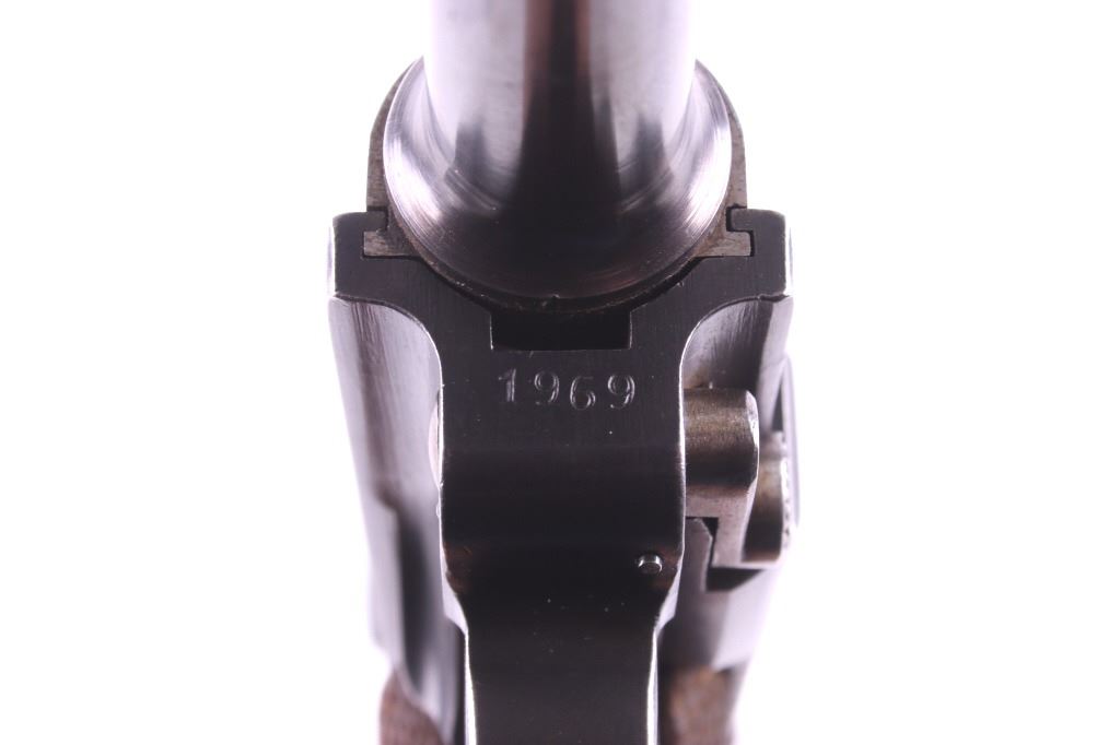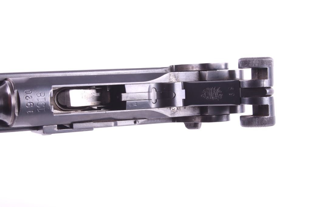 DWM marked and double dated German Luger with rare 5 7/8” barrel in 7.65 Luger caliber (.30 Luger). This was a scarce commercial model clearly stamped with its year of manufacture 1918. It is further stamped 1920 indicating it was a post World War I German government buy-back from civilian ownership. This was the first step in disarming the German population which at the time held an enormous amount of arms from the recently ended war. All such buy-back arms were stamped with the 1920 date. Many were then re-issued by the government to the police, navy and other agencies. This is a wonderful condition example with all metal parts having the matching last two digits of the full serial number 1969. Additionally, it retains all the proof marks including the “crown N’ firing proof, other proofs and “DWM” marking (Deutsche Waffen und Munitionsfabriken). This example also retains a beautiful blue finish, original sights and lovely correct and desirable “straw” coloring on the trigger and safety lever. It has finely checkered walnut grips and wood-bottom magazine. It is in mechanically excellent condition with a bright, sharp bore. A wonderful matching example full of history! This pistol qualifies as a Curio & Relic hand gun, and requires FFL Transfer or NICS Background Check. Serial Number: 1969