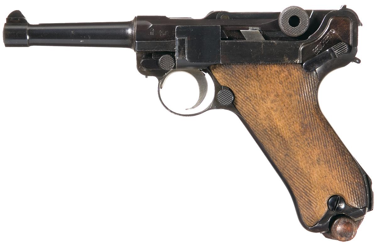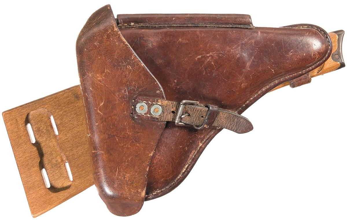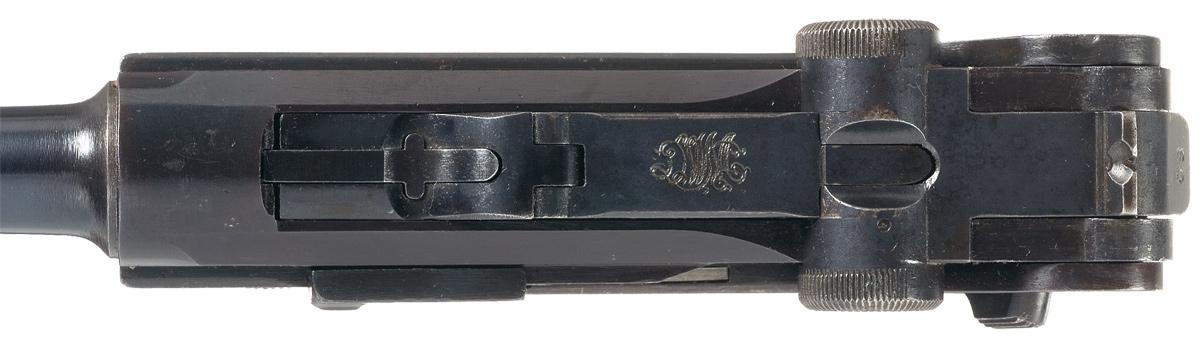 Fixed sights, with a blank chamber and "DWM" monogrammed front toggle. With the exception of a commercial "crown/ N" proof on the left side of the extension, no German proofs are visible. Next to the "N" proof is a Finnish "SA" military inspection proof. Standard "GESICHERT" and "GELADEN" markings on the upper safety position and extractor, and import marks on the underside of the barrel. With an unmarked wood and metal stock and a brown leather holster with "SA" stamp on the flap.