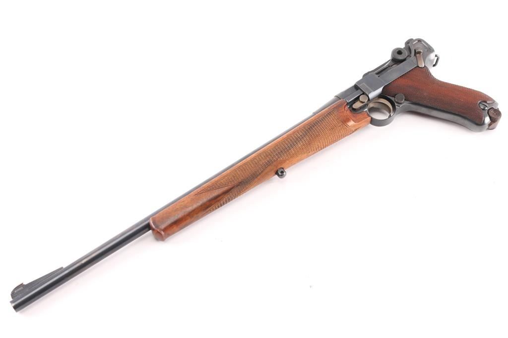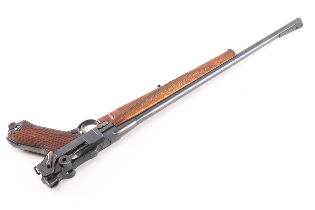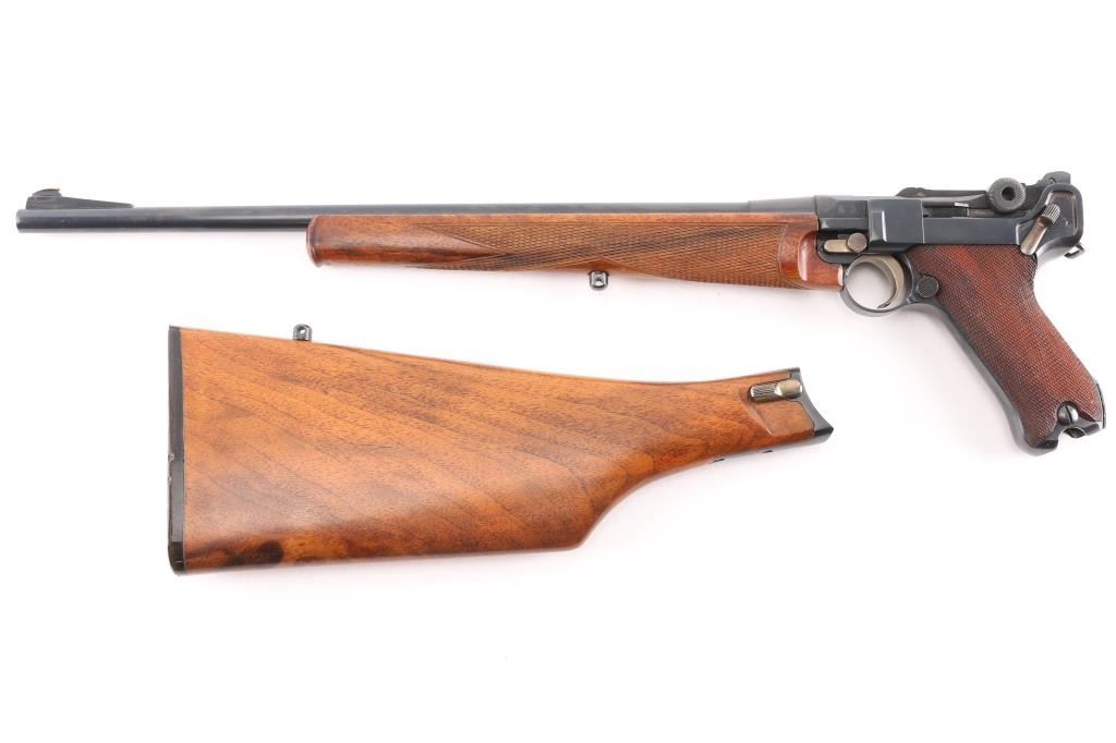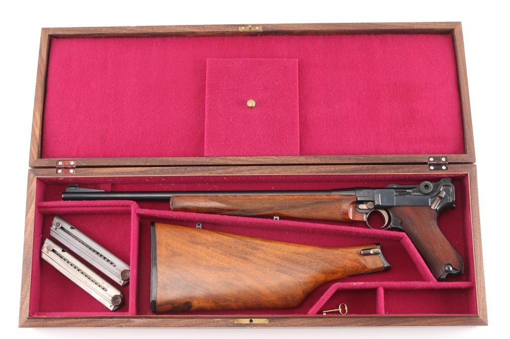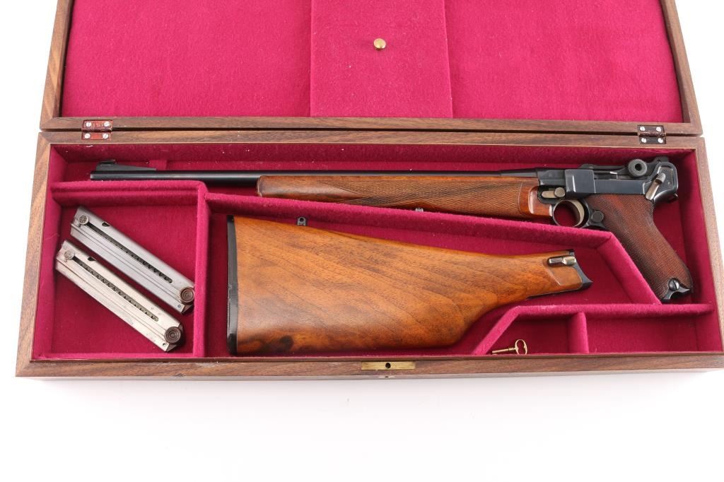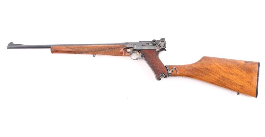 '1920' Luger carbine proofed on naval frame and made from surplus after WWI. Serial 4033 with 16.25" barrel and detachable carbine style stock. Excellent restoration to mint condition in custom wood case with felt lined interior. Experts estimate as few as 6 examples on naval frame. The bore is very good, the markings are very good and the wood stocks are fine. Includes two magazines both with wood bases marked "4033".