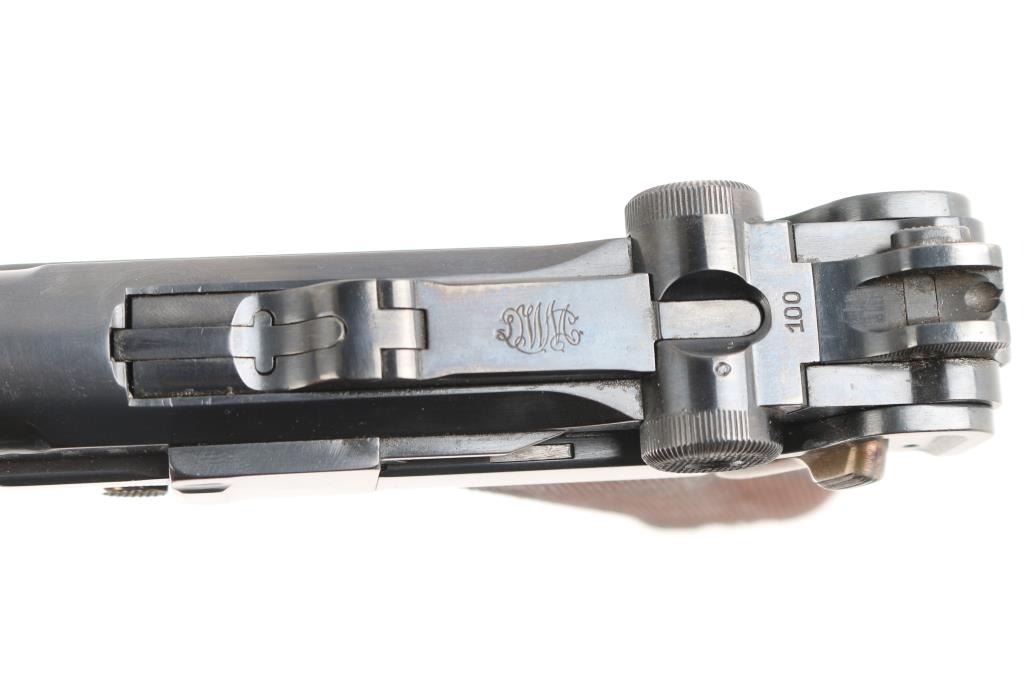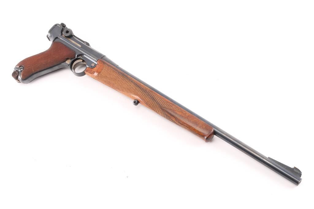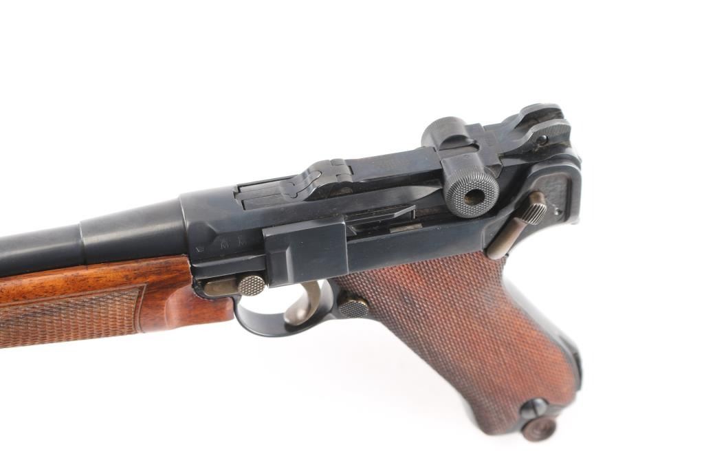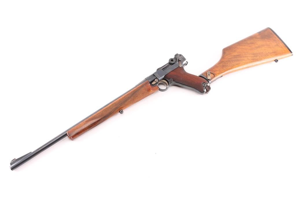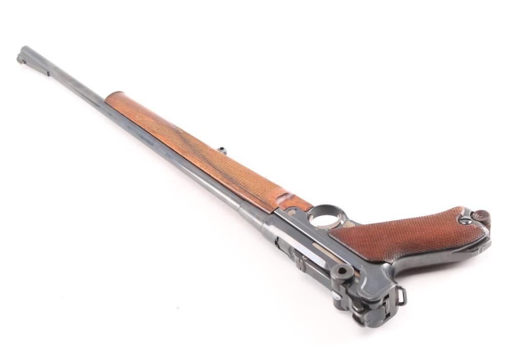 '1920' Luger carbine proofed on naval frame and made from surplus after WWI. Serial 4033 with 16.25" barrel and detachable carbine style stock. Excellent restoration to mint condition in custom wood case with felt lined interior. Experts estimate as few as 6 examples on naval frame. The bore is very good, the markings are very good and the wood stocks are fine. Includes two magazines both with wood bases marked "4033".