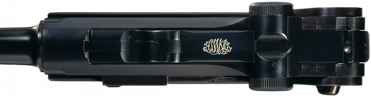 This is an example of a restored Model 1906 Commercial Luger. The top of the pistol has the blank chamber and the toggle has the DWM markings. The left side of the barrel extension has restamped Commercial Crown over "B", "U", proofs along with a small Swiss Cross proof. The bottom of the barrel has the commercial five digit serial number along with the Crown over "B", "U", "G" and "118,35" proofs, as well as the upside down shield firing proof of the DWM factory. The left side of the barrel is marked with three Crown over circled "BV" proofs. The left side of the toggle and breechblock assembly have the same Crown over "B", "U" proofs. It has the early style first pattern lower polished safety area and a grip safety on the rear grip strap. It is complete with a nickel-plated, unmarked magazine with an unmarked wooden base and fitted with the correct checkered walnut grips.