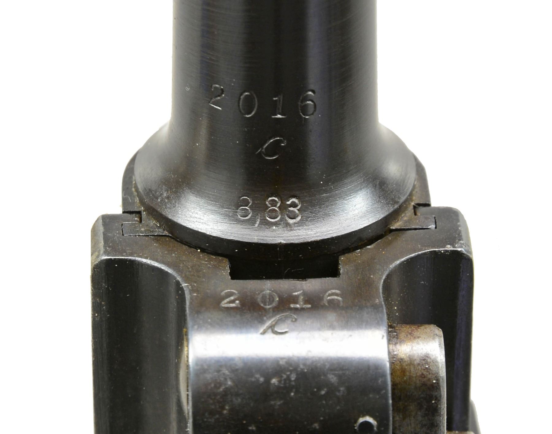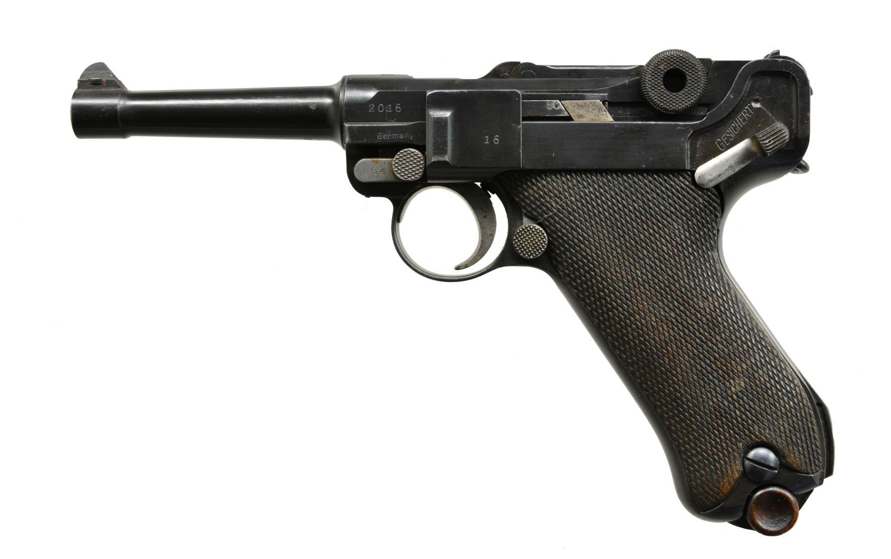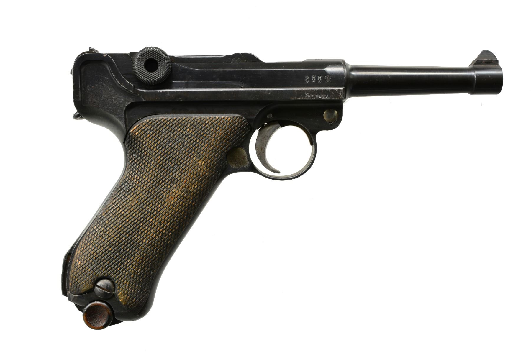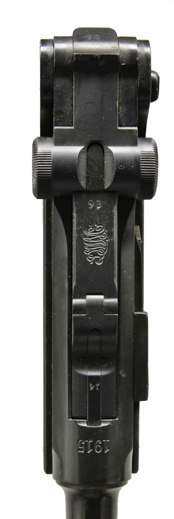 Cal. 30 Luger. S# 2016c. Bbl. 4". Chamber dated 1915. All matching numbers including replacement bbl. Grips not numbered. Appropriate straw colored parts except blued ejector. Rear toggle pivot unfinished. Both sides of frame have Germany export marks. MAGS: 1 good tin plated 8 rd. w/ stained appearance on most of body & unmarked wood base. CONDITION: very good appearance of metal finish; nicely refinished w/ contours & markings very well preserved. Occasional sm. spots of peppery oxidation; more pronounced on sides of frame under grips. Very faded straw colors w/ stained appearance. Left grip dark w/ moderately even flattened diamonds; right grip lighter w/ more flattening. Poor to fair bore w/ noticeable wear & cleaned even pitting. (19-5795/NW). CURIO. $750-1,000.