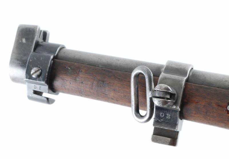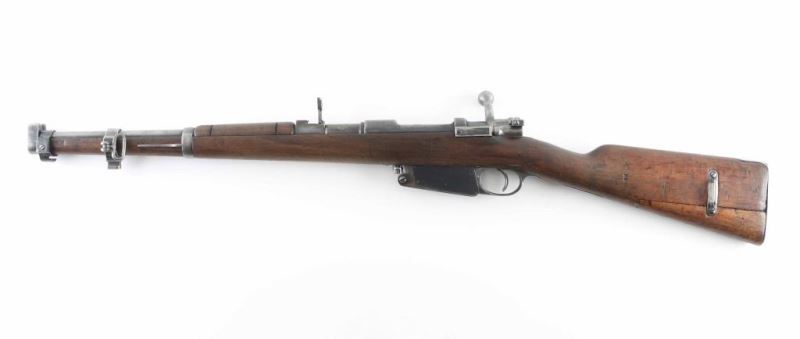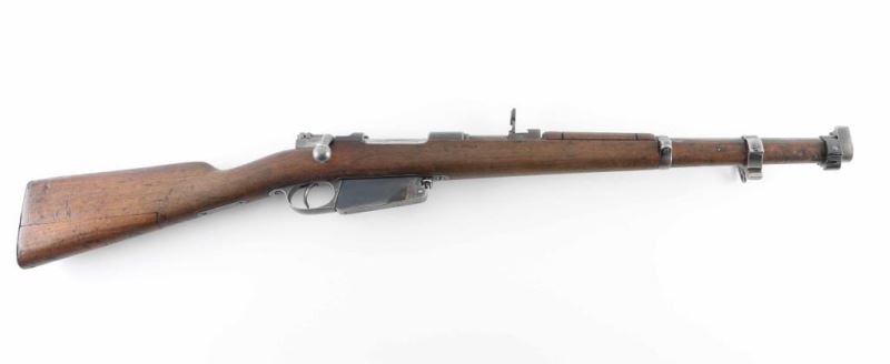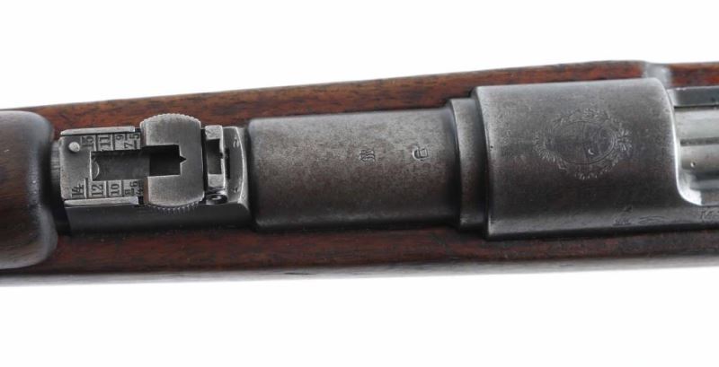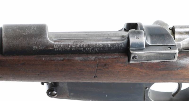 German made military bolt action rifle, originally made under contract for the government of Argentina, circa 1899. Features blued finish, wood stock with straight grip, 17.5" barrel, blade front sight with protector ears, flip-up ladder type rear sight, side mounted sling swivels, bayonet lug, manual safety. Bore is good condition, grayish grooves with strong rifling. Metal surfaces retain 20% blued finish, mostly in protected areas and on sides of magazine and rear of receiver. Most metal is dull gray, with some brownish color from patina. Wood is fair to good serviceable condition with dents and shallow gouges, large repair piece at toe, loose fitting handguard. Argentine crest on receiver ring. Most observed numbers match, with forward band mismatched, appears to be a later replacement. Bayonet lug installed backwards. Condition is NRA Good *** C&R Firearm ***