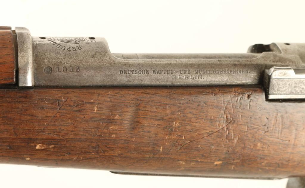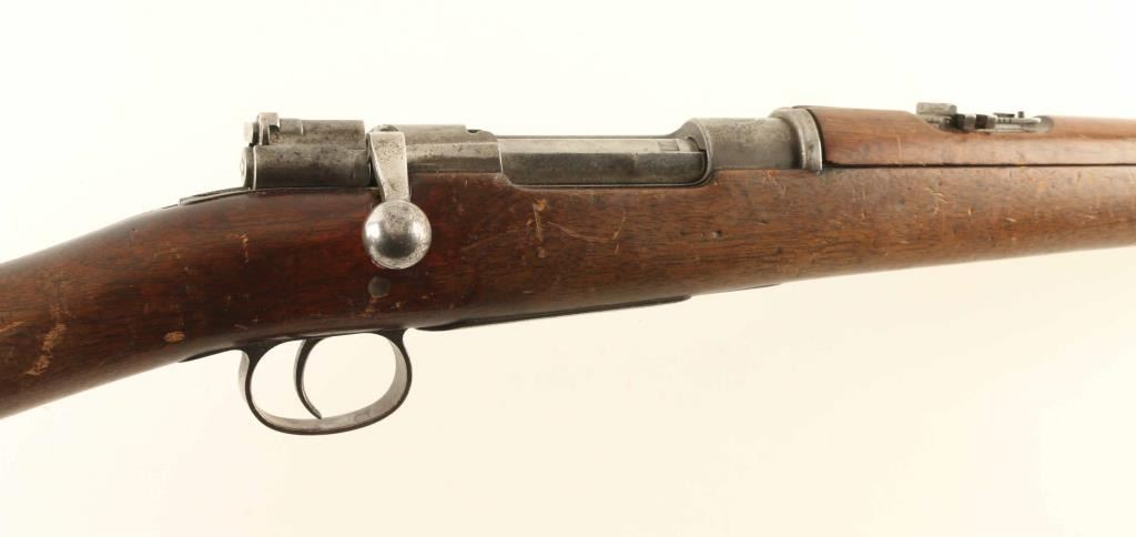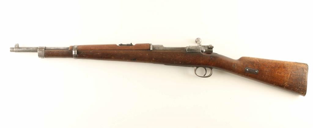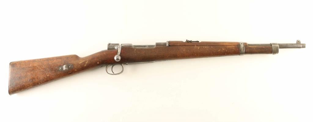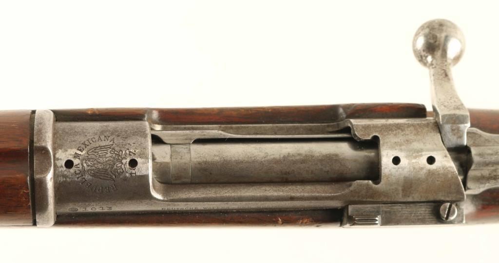 Mexican military rifle chambered for 7x57mm Mauser cartridge, made in Germany on a small ring Mauser action with 1895 type flat bottom bolt. Features side mounted sling swivel bases, turned down bolt, ladder style rear sight, blade front sight, approx. 18.25 inch barrel. No bayonet lug nor cleaning rod present. Bore is fair to good condition, dark grooves and strong rifling. Retains little finish, with some grayish color on barrel and some protected areas, brown color on receiver, thicker brown color from visible patina on bottom metal, mostly silver color overall. Stock is in good overall condition, has many dents and scuff marks, areas where the wood appears dry with bare wood. Sling swivels absent but bases remain, with rear base moved to right side. Bolt appears bent to clear a scope, and receiver top is drilled & tapped (4) places. Safety lever numbered "13". No import marks observed. Condition is NRA Fair *** C&R Firearm ***