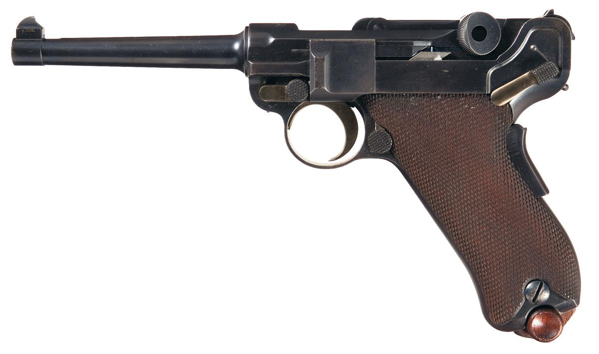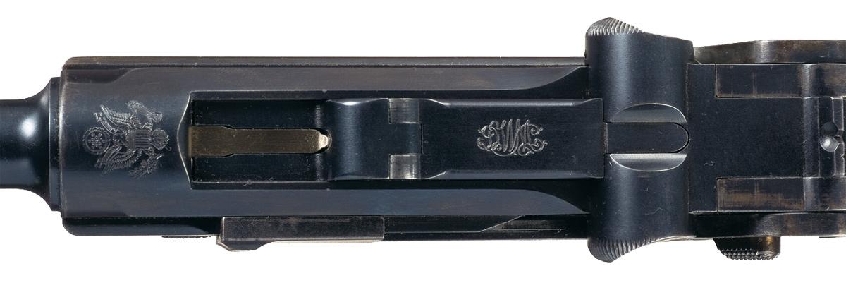 This is a nice representative example of a desirable DWM Model 1900 "American Eagle" commercial Luger pistol. These pistols were the true first commercial contract Luger pistols produced by DWM and can be found in the 2000-19000 serial number range, with this specific pistol falling about mid way in the production cycle. These pistols were specifically intended for sales in the U.S. market, hence the use of the American Eagle symbol on top of the chamber area with the DWM markings on the front toggle. This pistol has all the early desirable Luger features, starting with the superb hand fitted parts with the beautiful pre-war high polish rust blued finish, the early long frame, dished toggles with toggle lock on the right side, recessed breechblock, 4 3/4 inch fast tapered barrel, grip safety, no stock lug, straw colored small components and bright polished lower safety area. It is correctly serial numbered in the commercial fashion with the serial number under the barrel and on the front of the frame, which is also marked "GERMANY". The magazine is the correct nickel with a wooden base and is un-numbered. Some of the small parts are marked with the partial serial number "21". The pistol is fitted with checkered walnut grips.