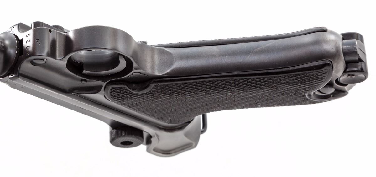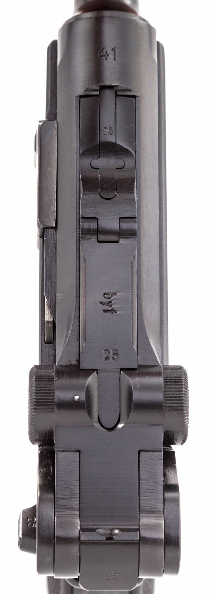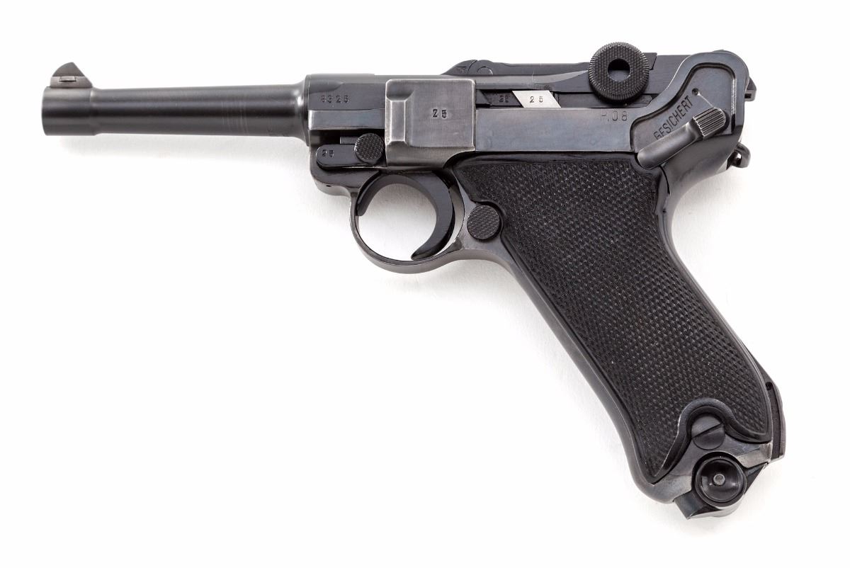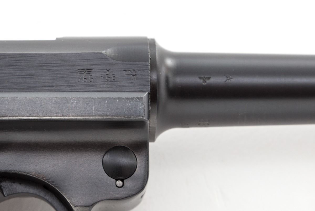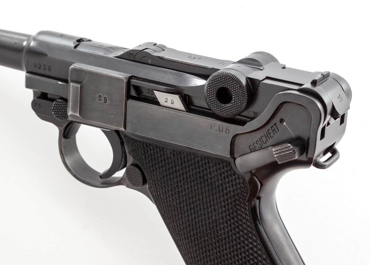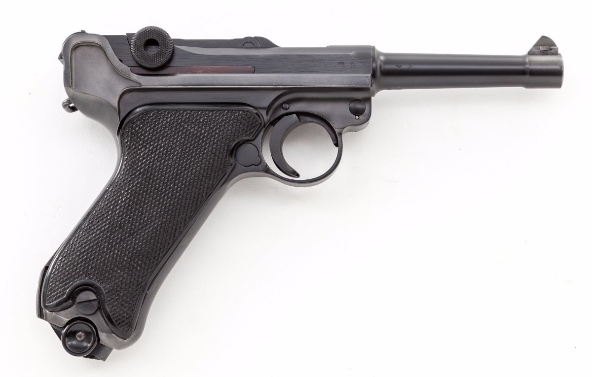 DWM Model 1900 American Eagle Luger, #10688, .30 Luger cal., 2'' barrel, blue finish, checkered walnut grips, with American Eagle on chamber, fixed combat sights, and Germany marked on frame.  Includes a tin-plated unmarked wooden base magazine.  Condition is excellent retaining approx. 99%+ original factory rust blue finish; straw parts retain approx. 98% color; fire blued screws retain approx. 99% blue.  Grips are numbered to the pistol and are excellent with minor flattening to the checkering, and no cracks or chips.  Action is tight, bore is bright with some debris in the grooves that should clean.  Est.:  $2,500-$3,500.  (C&R)