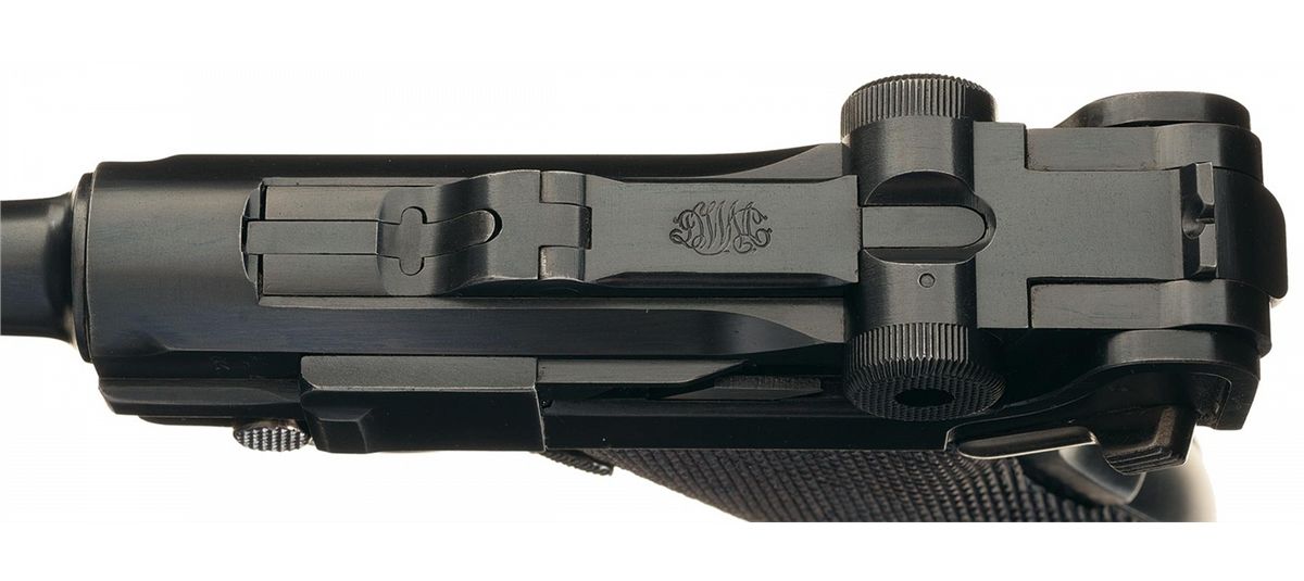 This is an example of a 1906/20 Commercial style Luger pistol that was subsequently custom made into a 9mm variant pistol. The chamber area is unmarked and it has the DWM logo on top of the toggle. The left side of the barrel extension has the commercial Crown over "N" proof with the full serial number on the front of the frame and underside of the barrel. The underside of the barrel is also marked "GERMANY" and with the matching serial number. Also carries the same Crown over "B, U, & G" proofs. The last two digits are on the takedown lever, the bottom of the side plate and the rear toggle. Fixed sights, straw colored small parts, grip safety, bright lower safety position, plated magazine with a wooden base marked */B" and fitted with checkered walnut grips.