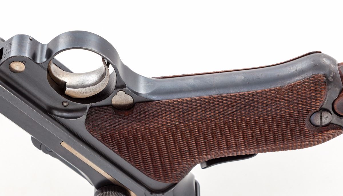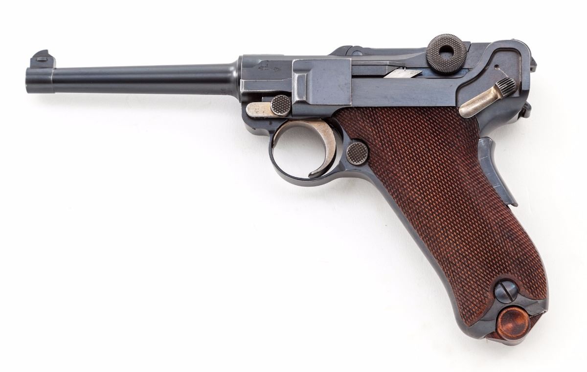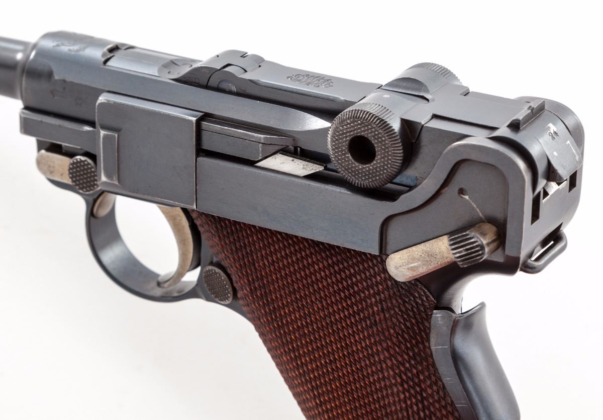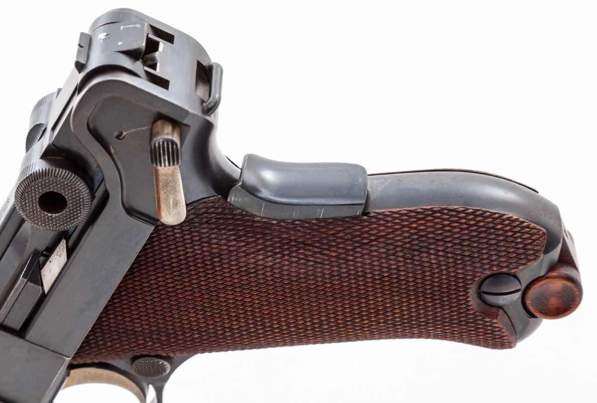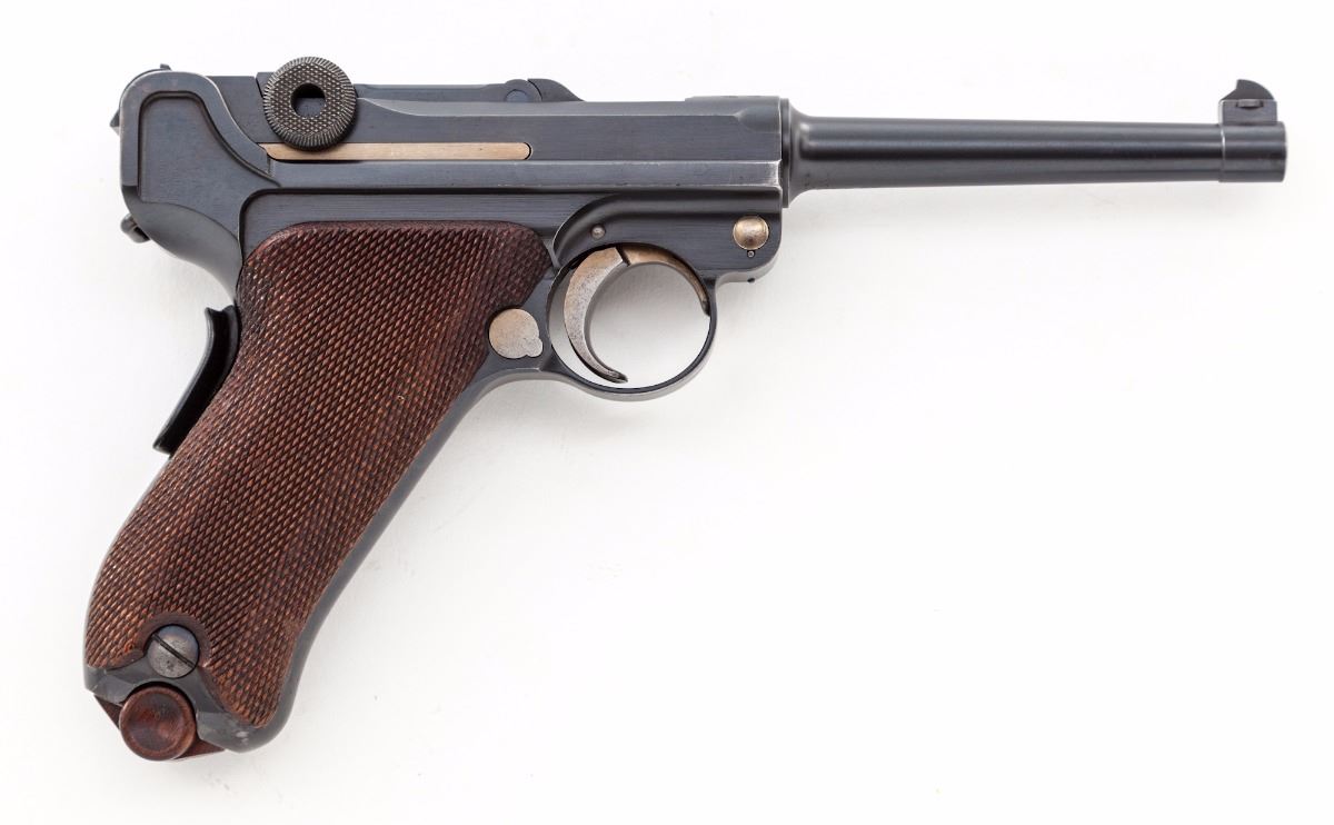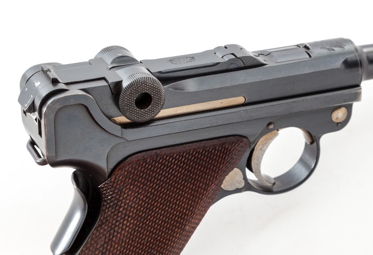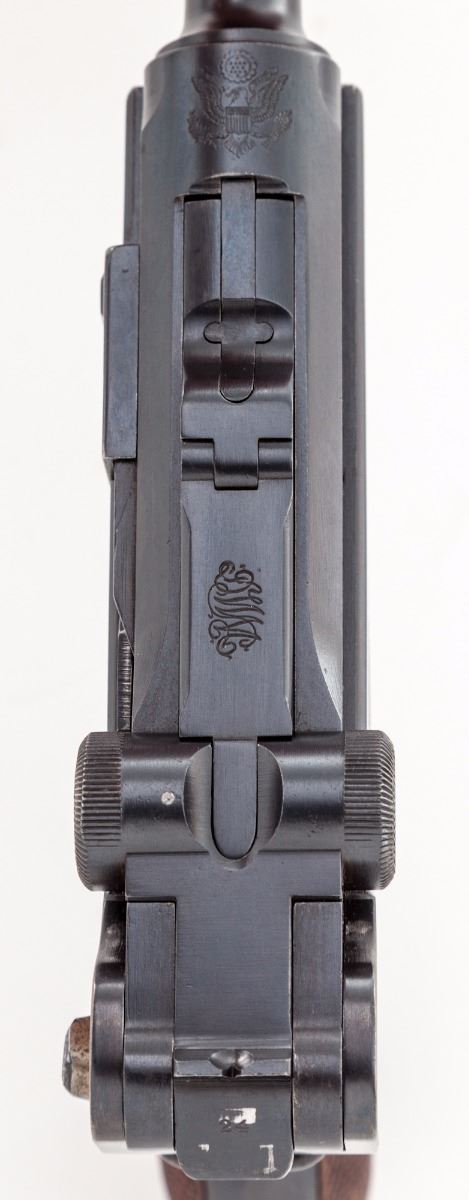 DWM Model 1906 American Eagle Luger, #46624, .30 Luger cal., 4-1/2'' barrel, blue finish, checkered walnut grips, with fixed combat sights. American Eagle on chamber, ''(crown)/B'', ''(crown)/U'', and ''(crown)/G'' proofmarks, and Germany marked on frame. Magazine is tin plated with a wooden base marked with a small flaming bomb, as seen in the 1900 American Eagle U.S. Test Eagles. Condition is excellent retaining approx. 99%+ original factory rust blue finish; straw parts retain approx. 98% color; fire blued screws retain approx. 99% blue. Unnumbered grips are excellent with minor flattening to the checkering, no cracks or chips. Action is tight, bore is strong with frosting that should clean. Est.: $2,500-$3,500. (C&R)