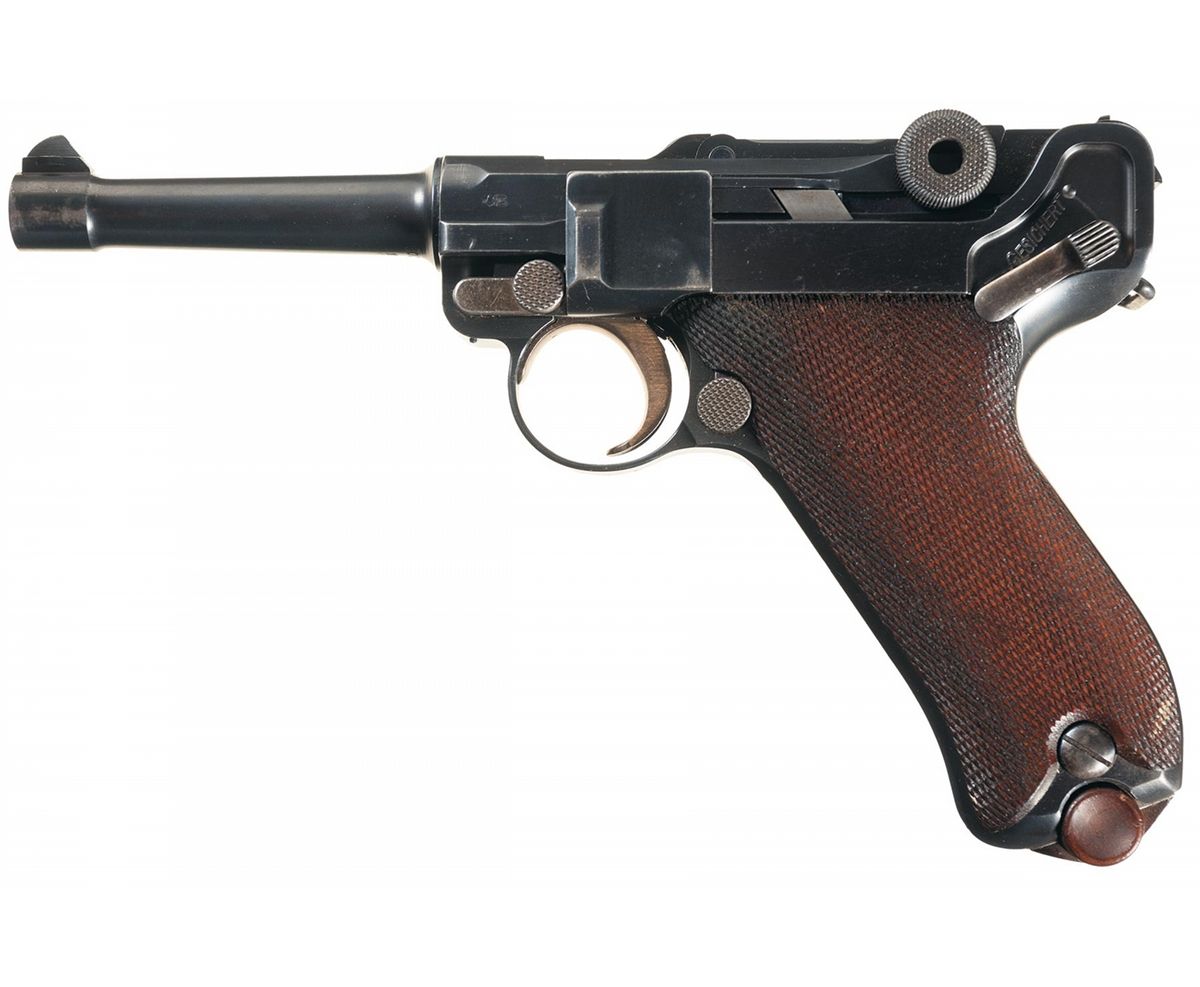 Very fine with 85% plus of the blue finish overall with edge and high spot wear with finish loss on the rear grip strap. A dent is present on the upper left "hump" of the side plate. The various small parts retain 70% of the straw colors. The grips are both very fine with nice original distinct checkering on both sides showing minor wear on the lower sides of the checkering with no handling marks. Mechanically excellent. This Luger has matching numbers on the various parts.