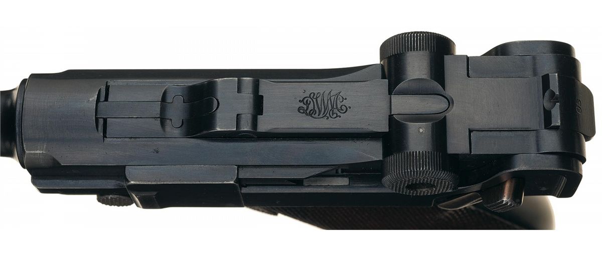 This is a DWM Model 1908 German Commercial Luger. It has a blank chamber with the DWM monogram on the toggle link. The left side of the barrel extension, breechblock, toggle and underside of the barrel are all marked with a single "Crown/N" Commercial proof. It is numbered in the commercial manner with the full serial number on the frame and underside of the barrel with the last two digits "08" on some of the various smaller parts. It has the standard fixed sights, standard safety area and extractor markings. It is fitted with an unmarked nickel plated magazine with unmarked wooden base. The right underside edge of the frame is importer marked "OOW INC. Chardon OH.,1908 Swiss 7.65".