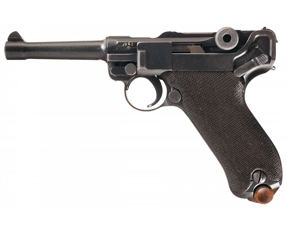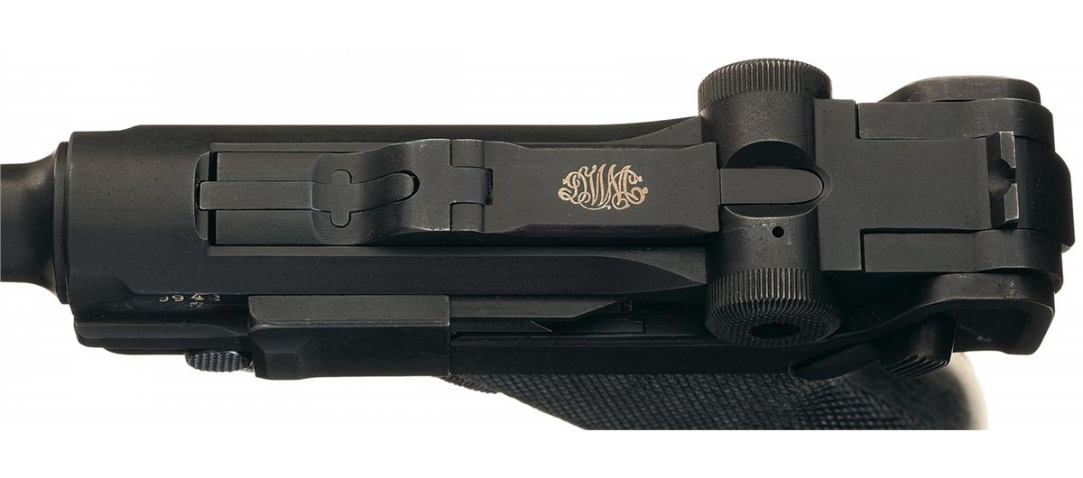 This is an example of a Second Issue Model 1908 DWM Military Luger Pistol that was subsequently reworked. Blade and notch sights, with a blank chamber and the "DWM" monogram on the toggle. The left side of the extension shows an Imperial Eagle firing proof and a pair of "Crown/Letter" proofs, with the Eagle repeated on the barrel and breechblock and a small proof on the right side of the frame, denoting the installation of a slide catch. Matching numbers are present on the barrel, extension, frame, takedown latch, side plate, trigger and toggle links, with "7413" on the nickel finished, wood base magazine. Also number "9942" has been stamped on the left side of the barrel extension.