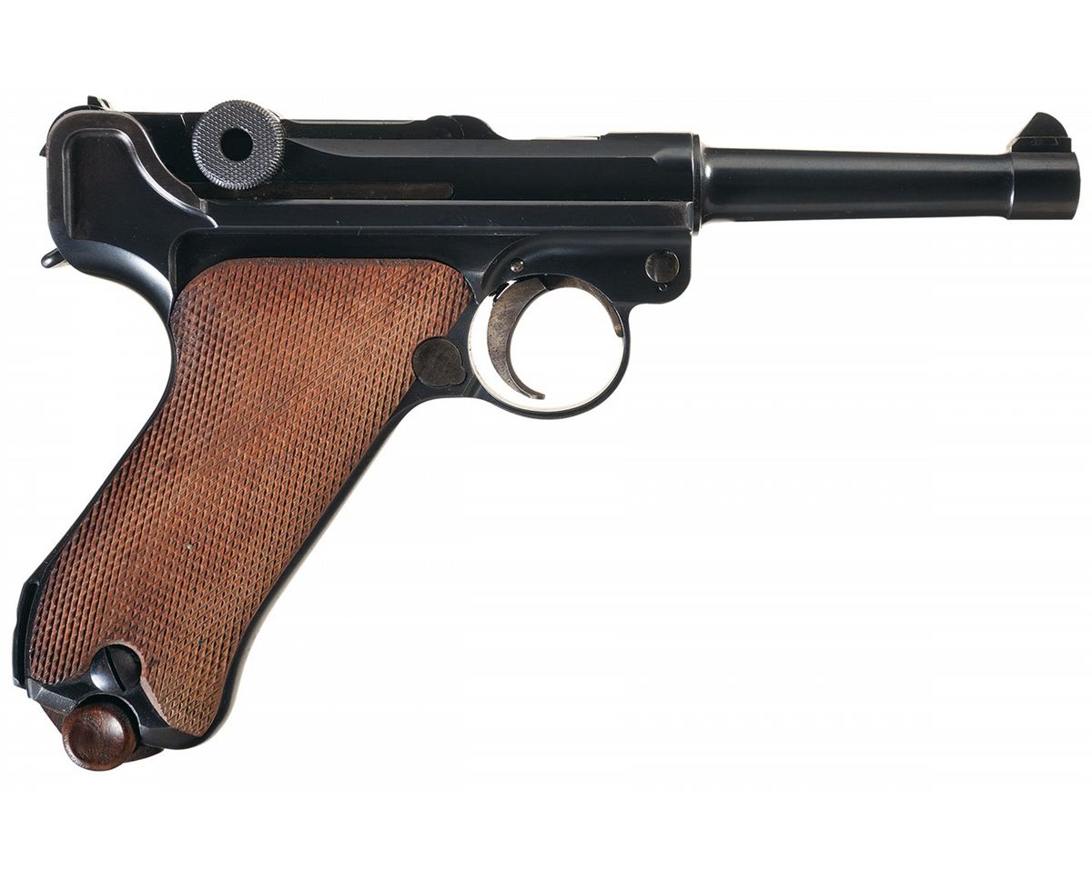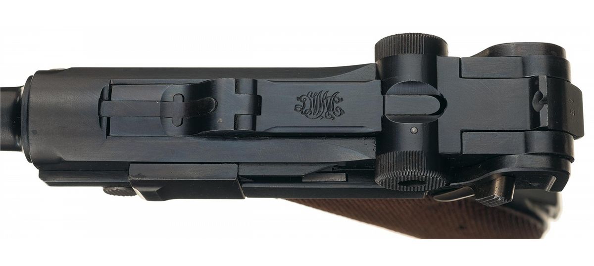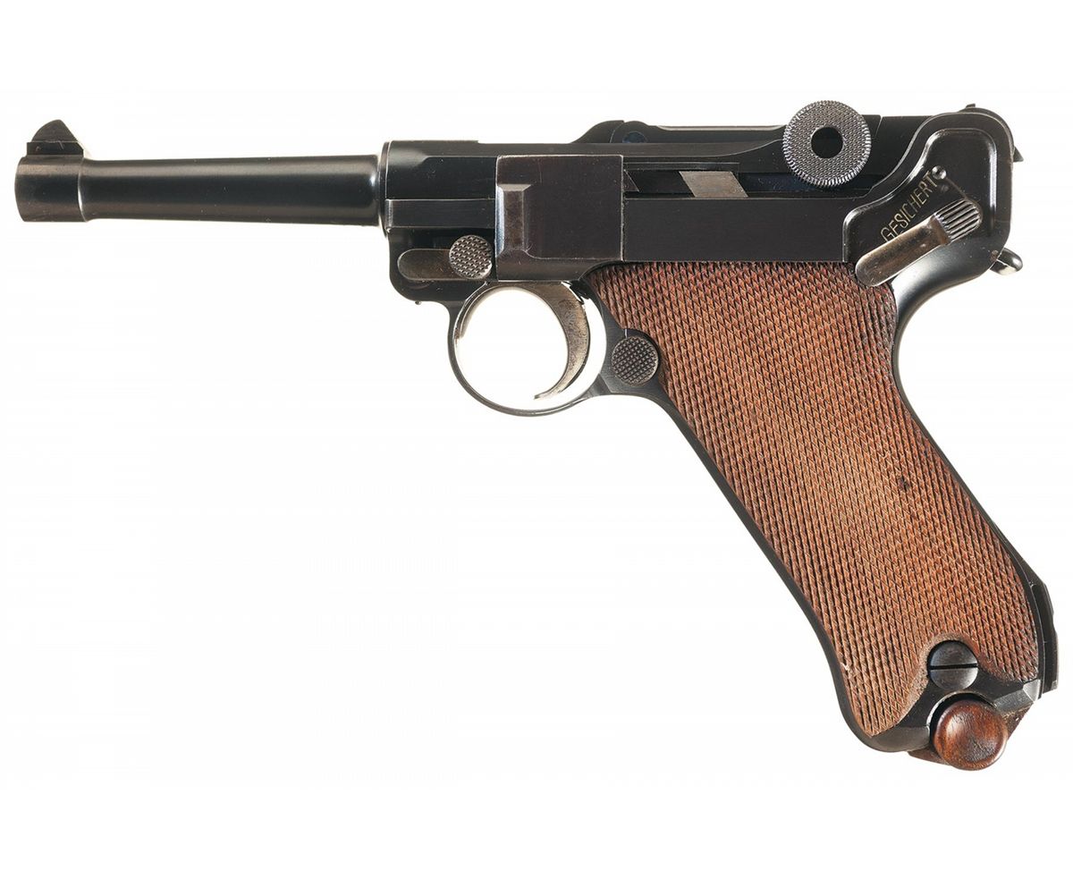 This is an exceptionally nice late 1920 era Commercial Luger chambered in 9 mm parabellum caliber. (Nearly all 1920 commercials were chambered for the 7.65 mm Luger Commercial auto caliber due to the Treaty of Versailles military caliber restriction placed on Germany after their surrender in World War I.) It has the standard blank chamber area with the "DWM" logo on the first toggle. It has the Commercial style serial number placement with the full number and letter code (8254u) stamped on the front of the frame with (8254) stamped on the underside of the barrel. The underside of the barrel and left side of the barrel extension are stamped with the "Crown/N" commercial proofs, with no export markings. It has the standard safety and loaded markings and is currently fitted with the original early post war style, light colored walnut checkered grips. It is complete with an early post-WWI commercial leather holster and two original nickel plated magazines with unmarked wooden bases.