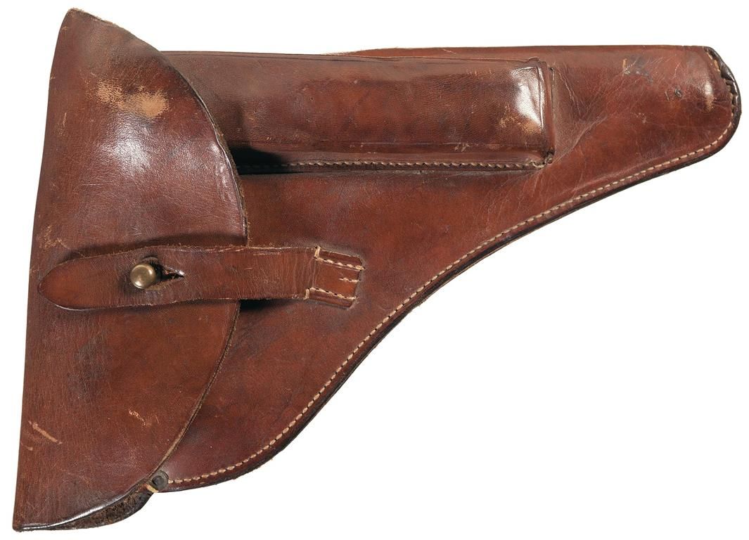 Excellent condition with 97% of the blue finish overall showing minor edge and high spot wear with 60% of the straw colors on the small parts. The grips are also in very fine condition with nice distinct checkering on both sides, with minor handling marks. Mechanically excellent. The holster is in fine condition with a nice even original brown color overall with tight stitching. An excellent early 1920 Commercial Luger pistol rig.
