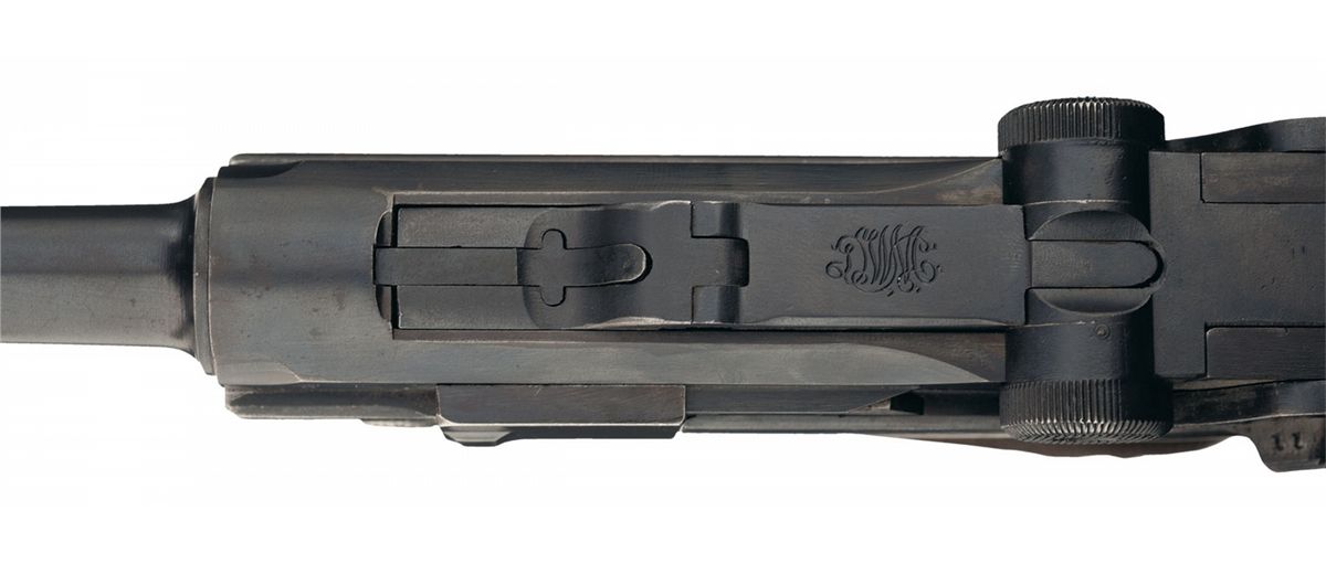 This is an example of a post WWI manufactured DWM Model 1920 commercial semi-automatic pistol. The top of the chamber is blank and the front toggle link is marked with the "DWM" logo. The left side of the barrel extension, the underside of the barrel and the left side of the toggle link are marked with the commercial "crown/N" proofmark. The right side of the barrel extension is marked "MADE IN GERMANY" and the matching serial number is marked on the front of the frame and underside of the barrel. The partial serial number "11" is marked on some of the small parts. Standard fixed sights, blue finish, straw finish small parts, unmarked nickel magazine with wooden base, stock lug and fitted with checkered walnut grips.