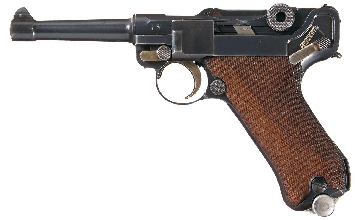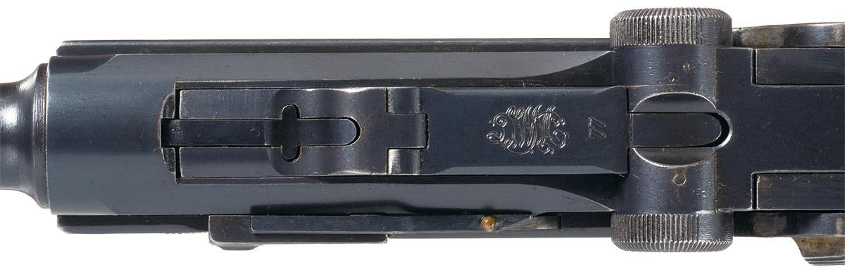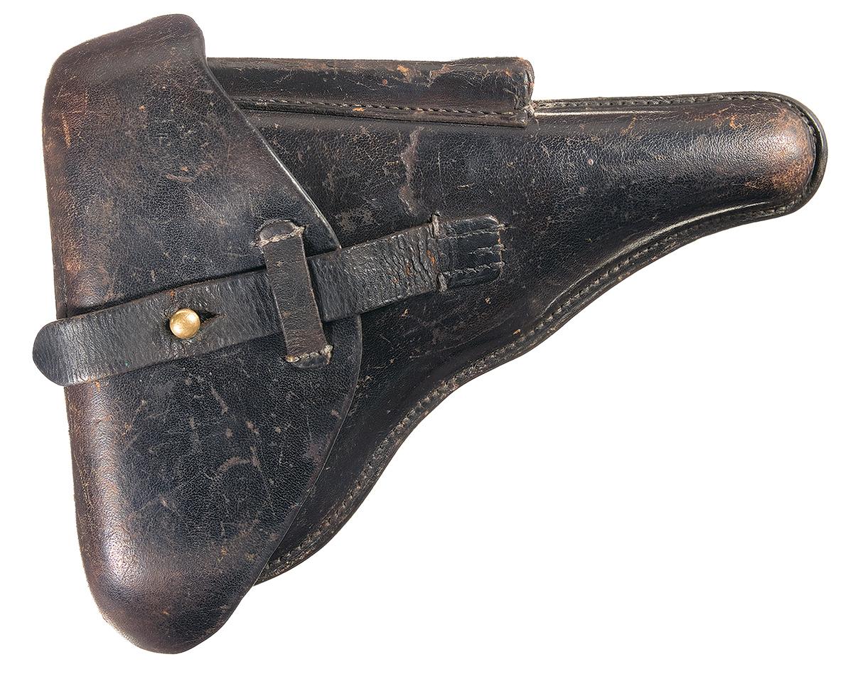 Fixed sights, with the blank chamber and "DWM" monogrammed toggle. "Crown/ N" proofs are present on the left side of the extension and breechblock, with "crown/ gothic letter" on the extension and barrel. The firing pin is unmarked, otherwise numbers are matching, and the front strap is stamped "S.D. IV 581.". Checkered walnut grips, with a Haenel production alloy magazine. With a black leather Robert Larsen (Berlin) holster, dated 1934, with takedown tool.