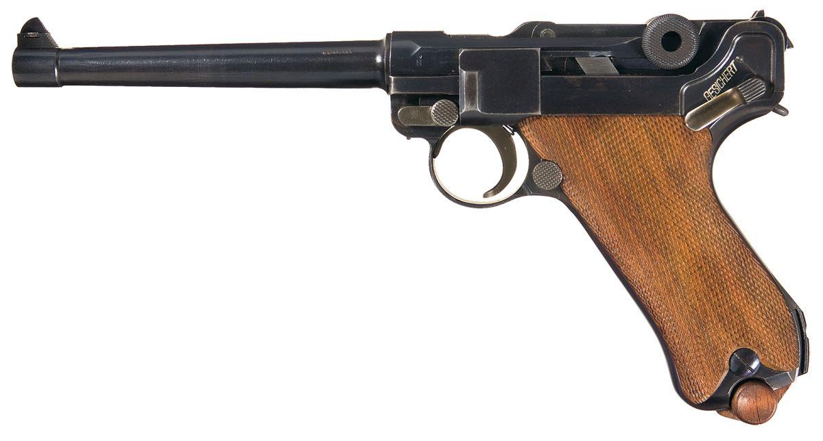 Standard markings and features, with the barrel being period custom made of the long variation, unnumbered and marked "GERMANY" (different barrels were available for the Lugers sold commercially in the U.S. in the 1920's and 1930's), with matching partial numbers on the small parts and unnumbered wood base nickel magazine.