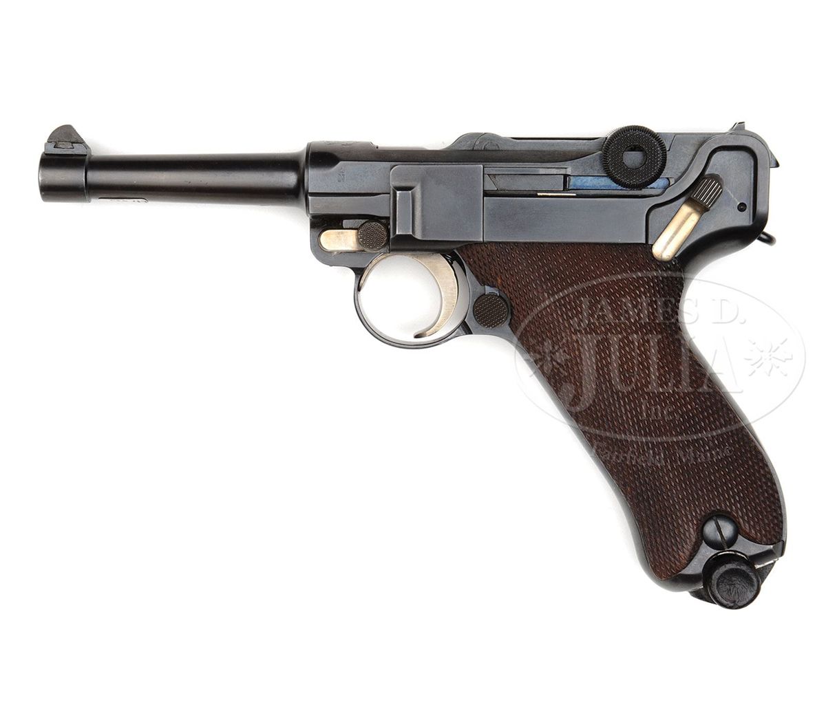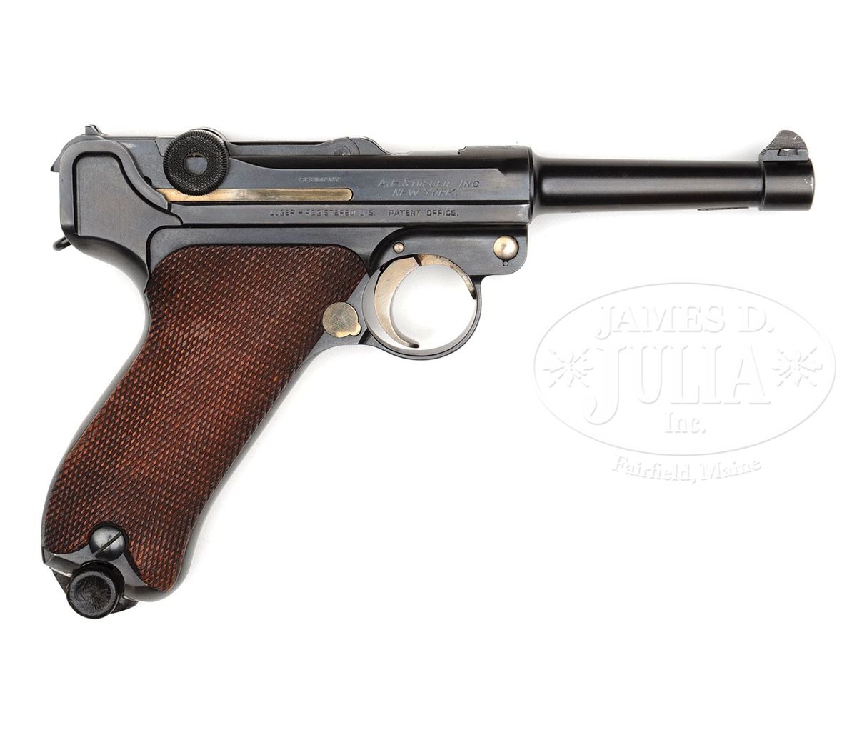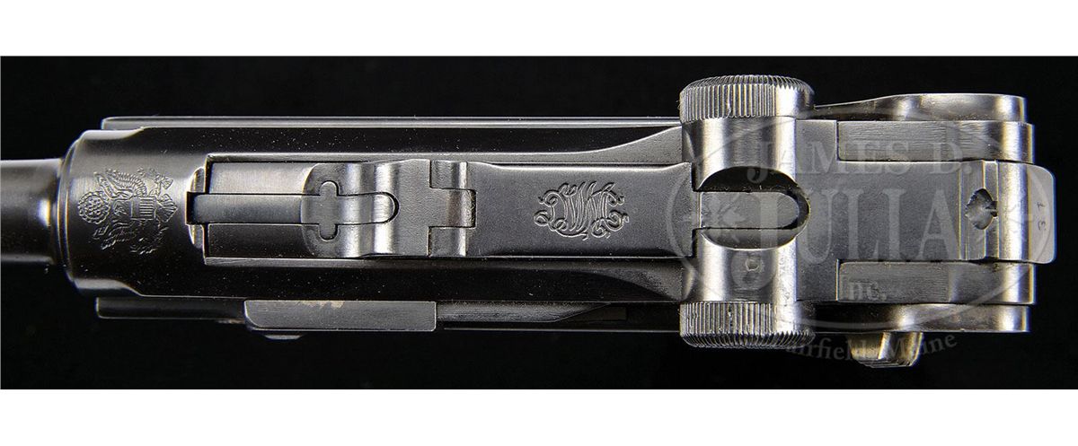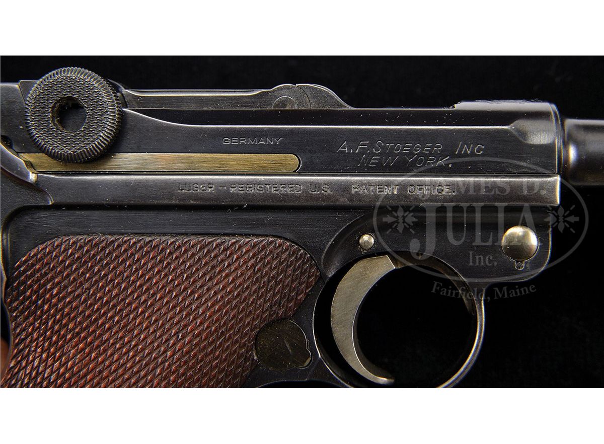 SN 431v. 4" 30 cal. bbl American Eagle above chamber. "DWM" scroll on center toggle link. Crown N Proofed. Three digit V-range SN. "Germany" stamped on right receiver. Three-line address with "A.F.Stoeger Inc New York." on right receiver above "LUGER-REGISTERED U.S. PATENT OFFICE." on right frame rail. Checkered walnut grips. Stock lug has been professionally removed and could be professionally restored. All numbered parts are matching. This gun is featured on pp. 750 and 763 of Dr. Geoffrey Sturgess' The Borchardt & Luger Automatic Pistols. PROVENANCE: Collection of Dr. Geoffrey Sturgess. CONDITION: Excellent. Retains 98% blue which is orig except for touched up area where the stock lug was removed. 85% orig straw. Bore is bright and sharp. Grips are lightly worn with some minor indents on checkering. Plain wood bottom magazine is excellent. Mechanics are sound. 4-52808 BWS47