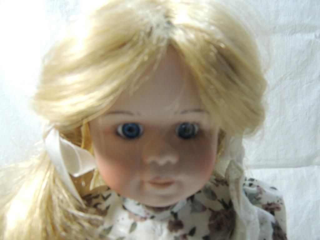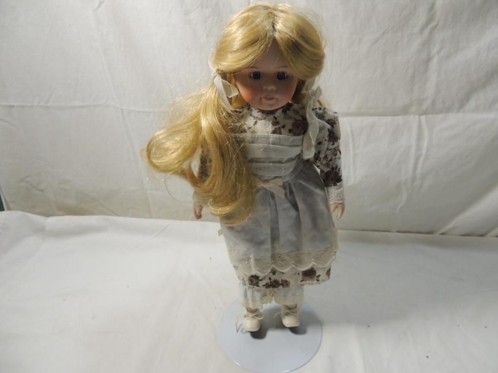 16" TALL PORCELAIN DOLL FLORAL DRESS WITH APRON. LONG BLONDE HAIR WITH RIBBONS IN HER HAIR. BLUE EYES. ON STAND.