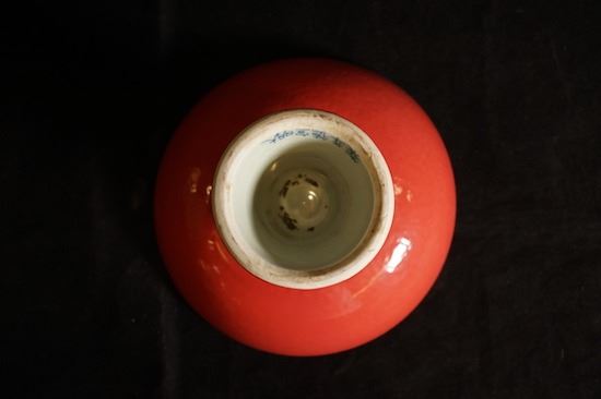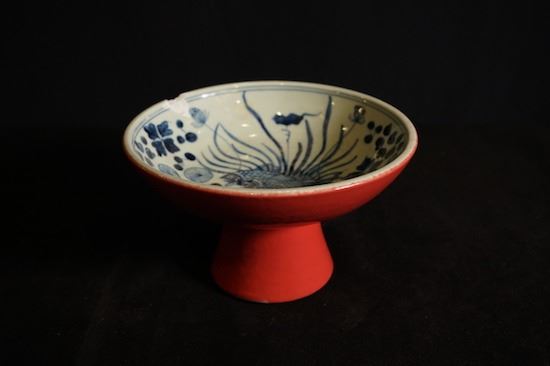 "Da Ming Xuan De Nian Zhi" mark, red-glazed blue and white with "Fishes" pattern tazza, small crack