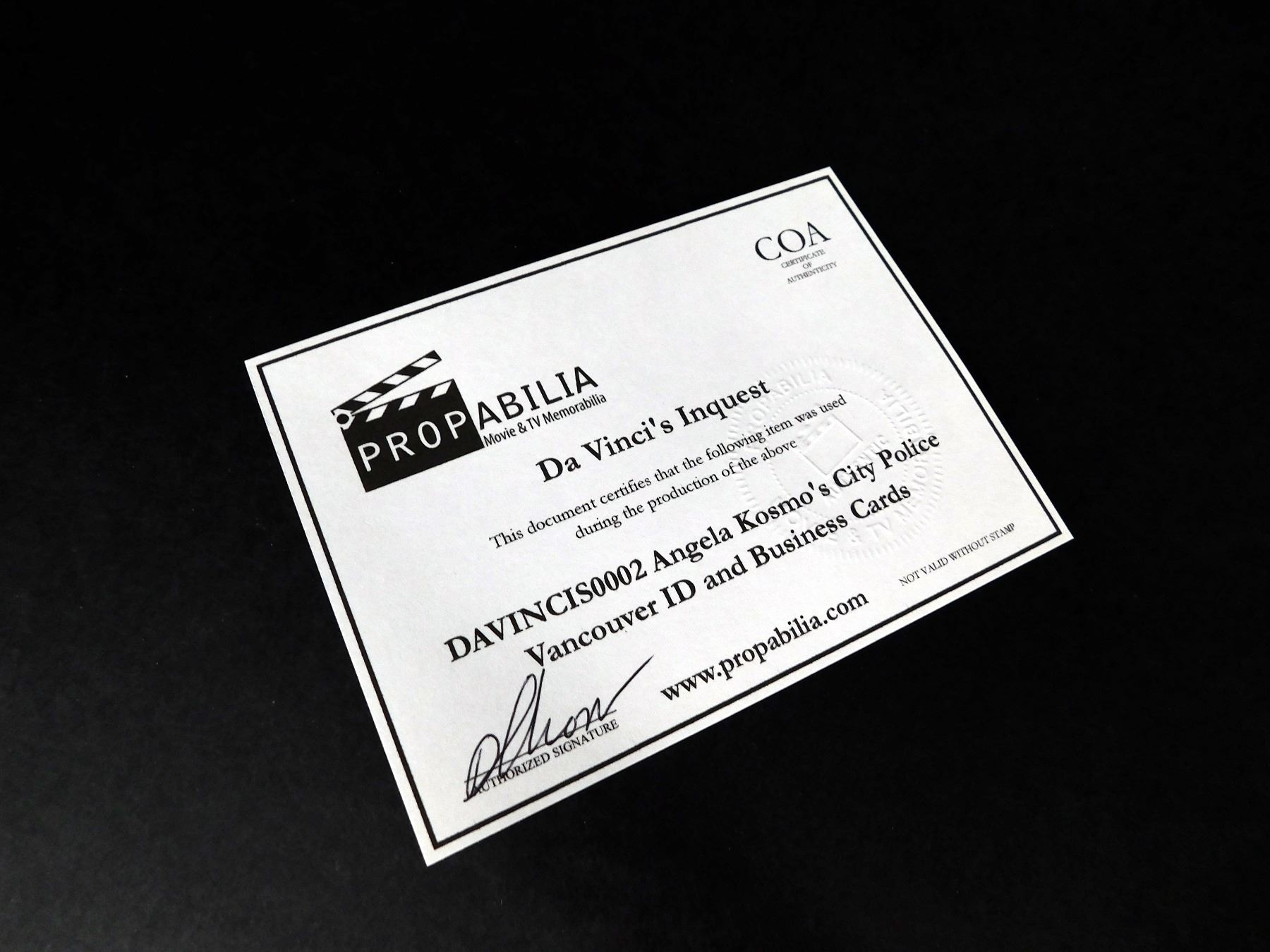 This ID and business cards was acquired by the production for use in 'Da Vinci's Inquest' (CBC, 1998-2006).