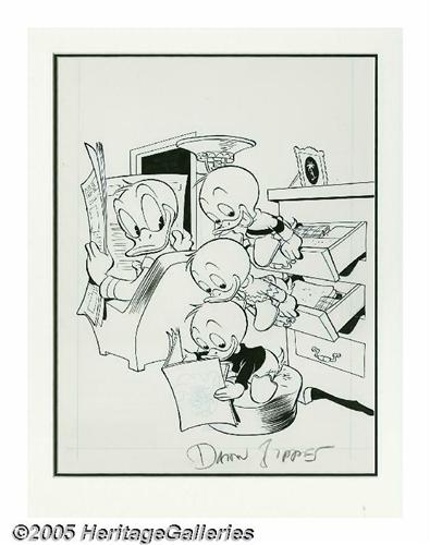 <B>Daan Jippes - "Ducks in a Row" Cover Original Art (undated).</B></I> Daan Jippes' clever gag shows off the teamwork of Huey, Dewey, and Louie as they get their ducks in a row. The Junior Woodchucks get three times the comprehension out of their reading material by multi-tasking. Their Uncle Scrooge would applaud that; meanwhile Donald Duck gets a smile out of their participation in his reading hour. The talented Daan Jippes worked closely with the master, Carl Barks, handling art chores on the Junior Woodchucks stories scripted by Barks in the 1970s. The image area of this cover is 11" x 14.5", the art is in Excellent condition, and Daan Jippes has signed the art at the lower right.