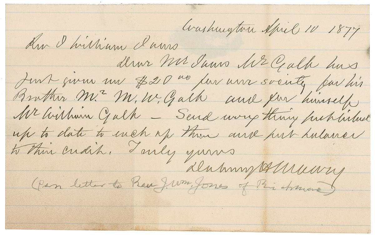 Confederate general and military author and historian (1822–1900) who fought at Corinth, Vicksburg, and Mobile. Two items: ALS signed “Dabney H. Maury,” one page, 8 x 5, lined sheet, April 10, 1877. Letter to J. William Jones regarding the Southern Historical Society, which was founded by Maury, and membership payments. In part, “Mr. Galt has just given me $20.00 for our society for his brother Mr. M.W. Galt and for himself Mr. William Galt”; and a signed book, Recollections of a Virginian. Later printing. NY: Charles Scribner’s Sons, 1894. Hardcover, 5.75 x 8.25, 279 pages. Signed and inscribed in ink on interior page by Union General Rush C. Hawkins, “A very charming personal account by a Southern Gentleman of the ‘old school.’ I knew many like him sixty years ago. But alas now, I might search our whole country over, in vain, for another like him. We have become a nation of hustling and real gentleman don’t count. RCH. August 27, 1914.” Also signed on the half title page, “Rush C. Hawkins July 20, 1914.” In fine overall condition. RRAuction COA.