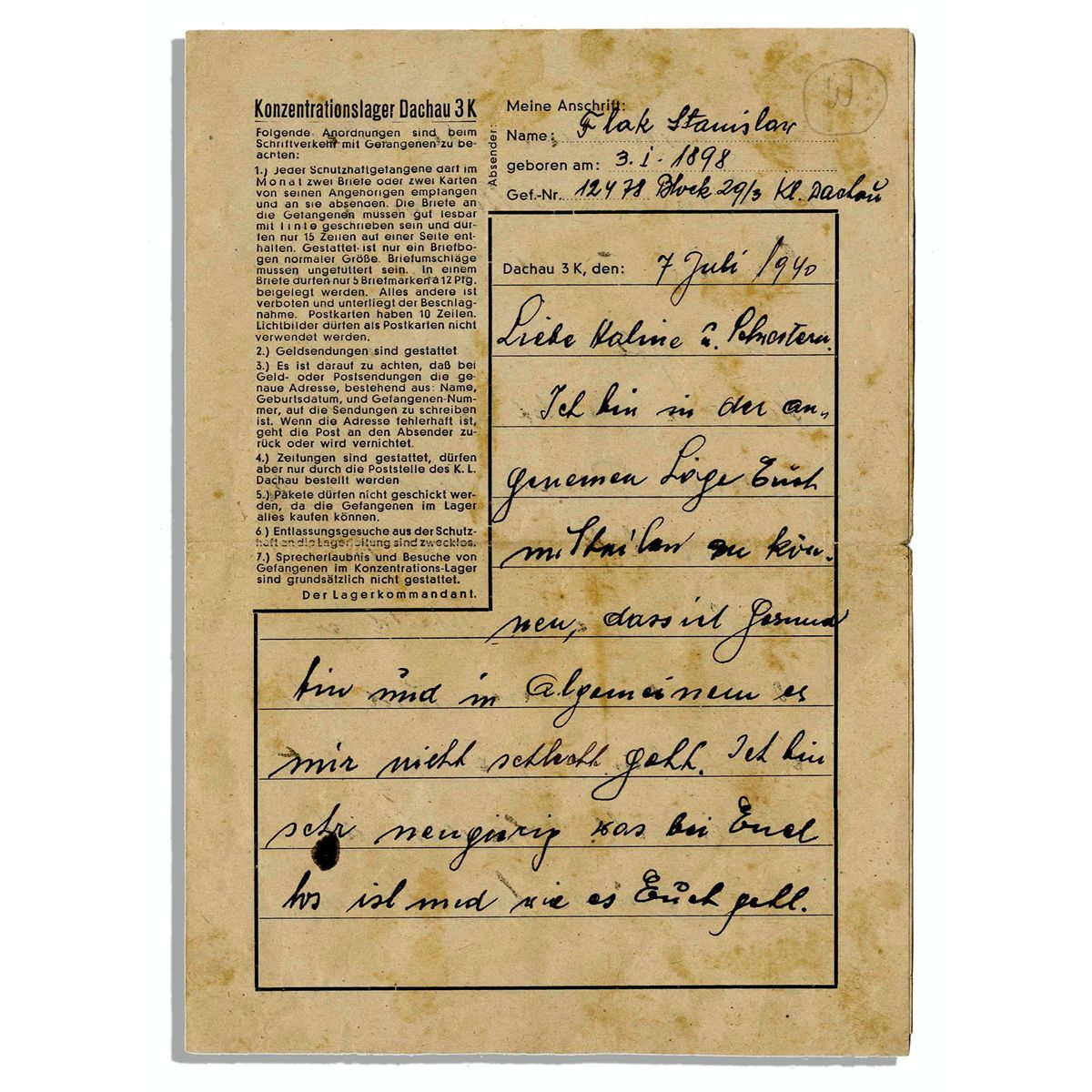 1940 Dachau concentration camp autograph letter signed on official ''Konzentrationslager Dachau K3'' stationery that lists camp rules in German. Letter written in German reads in part: ''... am healthy and I am generally not too bad...I beg you sisters to take care of yourselves and hope that my wishes are being followed...All lies in God's hands and hope that all will sort itself out...'' Letter measures 6'' x 8.25'' on 3pp. in a card-style foldout with toning and foxing throughout. Overall very good. With partial translation.
