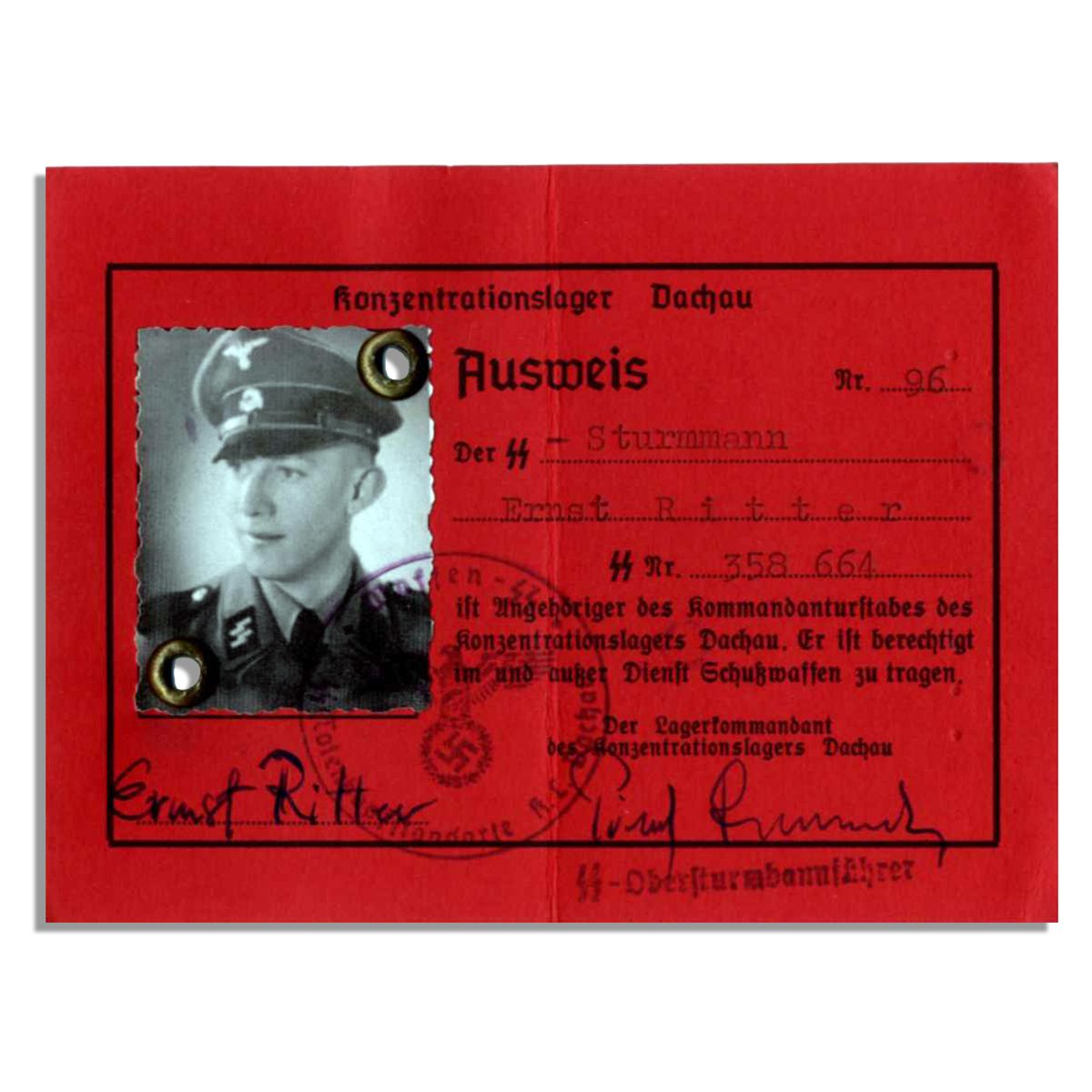 Dachau Concentration Camp SS guard photo ID. Official ''Konzentrationslager Dachau'' ID badge for SS ''Storm Man'' Ernst Ritter. The 4.5'' x 3.5'' red cardboard badge bears a 1.25'' x 1.75'' glossy photo of the guard and official swastika-stamps of the Nazi regime, including that of the SS Obersturmbannfuhrer, or Senior Storm Unit Leader. A typed instruction on the verso states that the guard is allowed entry to the F.K.L., the women's concentration camp. Minor soiling to badge, which has been folded, else near fine.