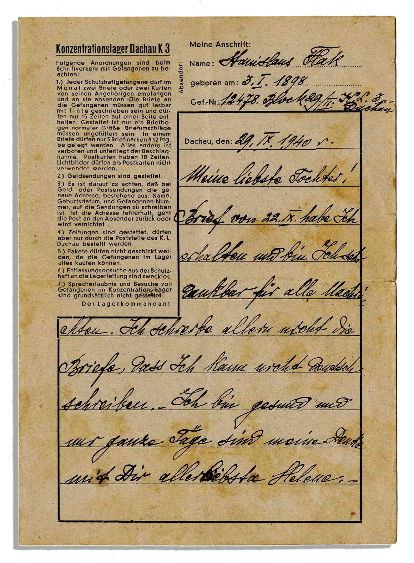 Rare 1940 autograph letter signed from Nazi Germany's first concentration camp, Dachau, on official ''Konzentrationslager Dachau K3'' stationery. Written in German, letter reads in part: ''…My dearest daughter, I have received your letter…I am very thankful for all the news…I am not speaking German very well…For your name's day I am sending you best wishes, health, and all the best to little 'Mickas'…Your Father''. Letter measures 6'' x 8.25'' on 3pp. in a card-style foldout with toning and foxing. Very good. With partial translation.
