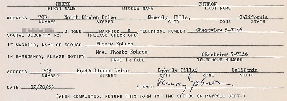 Playwright and screenwriter (1911–1992) and father of Nora Ephron. DS one page, 8.5 x 3, December 28, 1953. Ephron’s W-4 listing his personal information, including address, phone number,and emergency contact. Signed at the conclusion by Ephron. In fine condition, with several vertical folds lightly passing through single letters of signature.