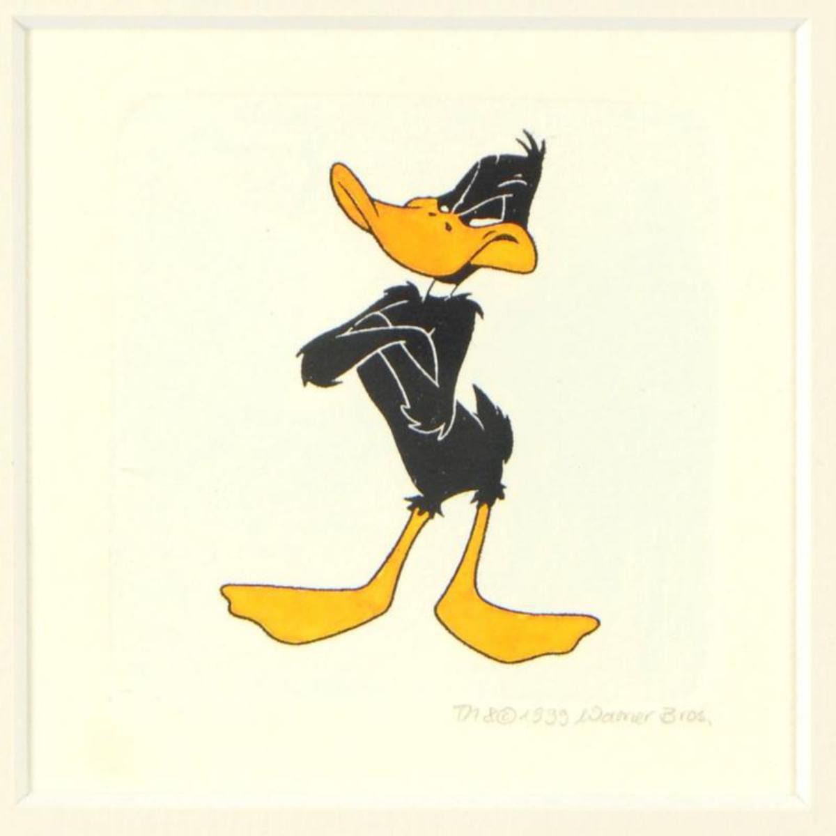 "Daffy Duck (Arms Crossed)" is a limited edition etching on paper with hand-tinted coloring from Warner Bros, numbered and dated 1999. This piece comes framed. Measures approx. 9" x 9" (with frame), 2.5" x 3" (image). Reference #: 235699.