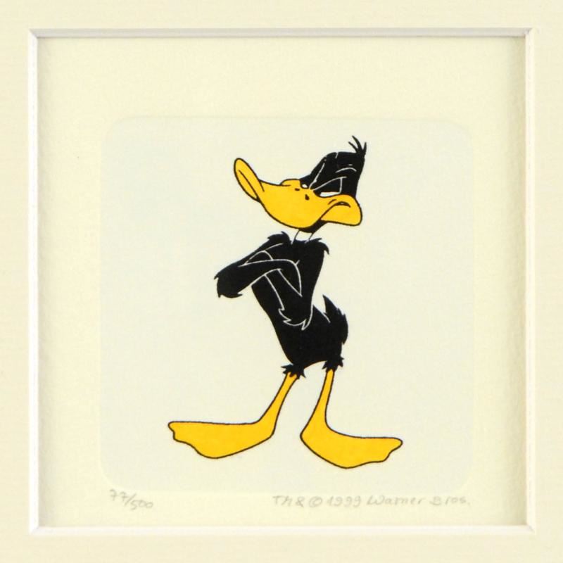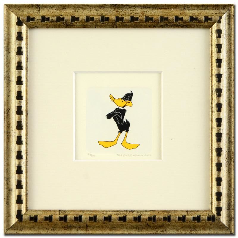 "Daffy Duck (Arms Crossed)" is a limited edition etching on paper with hand-tinted coloring from Warner Bros. (dated 1999) and numbered! This piece comes framed. Measures approx. 9" x 9" (with frame), 2" x 2.5" (image).