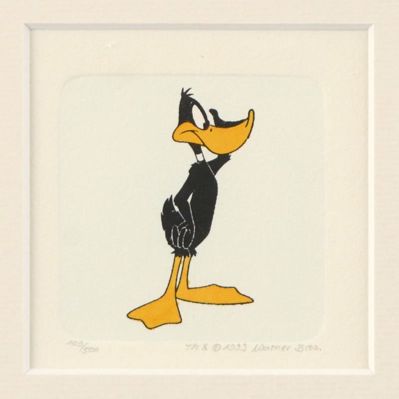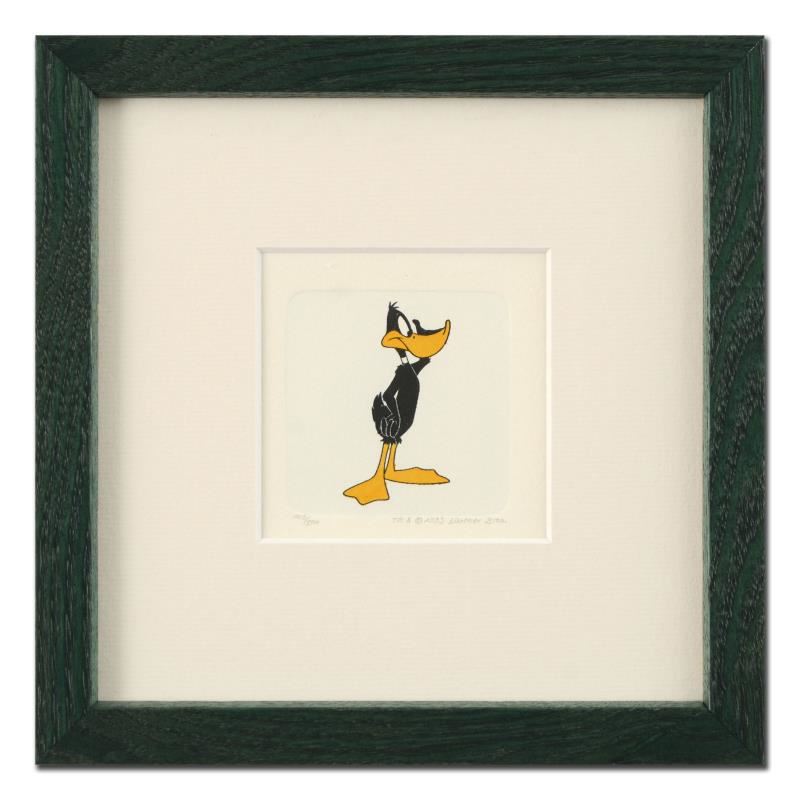 "Daffy Duck (Looking to the Side)" is a limited edition etching on paper with hand-tinted coloring from Warner Bros, numbered and dated 1999. This piece comes framed. Measures approx. 8.5" x 8.5" (with frame), 1" x 2" (image). Please allow 5 additional business for items that include canvas stretch or framing.