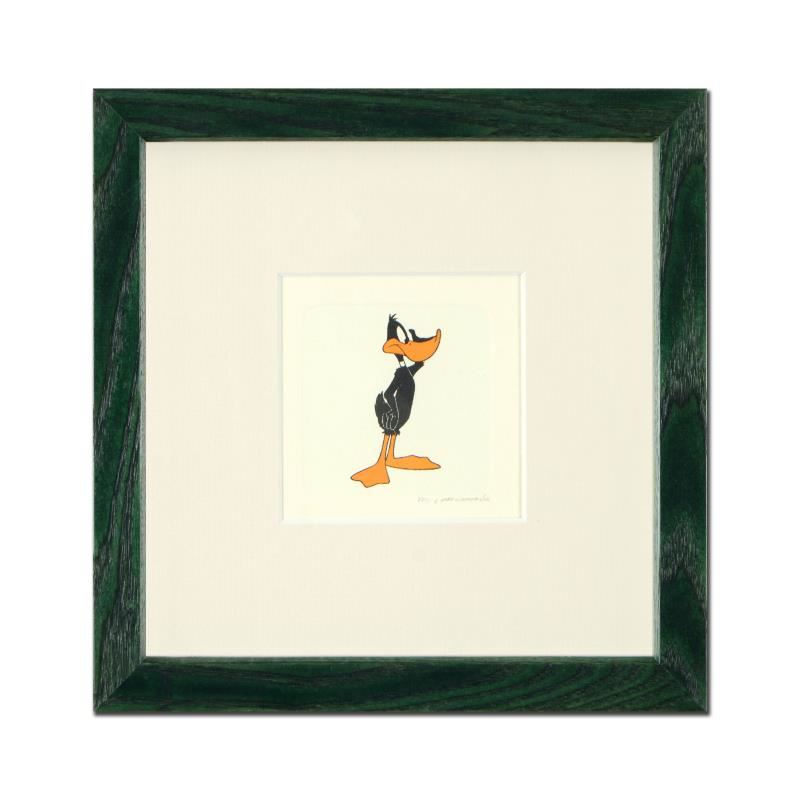 "Daffy Duck (Looking to the Side)" is a limited edition etching on paper with hand-tinted coloring from Warner Bros, numbered and dated 1999. This piece comes framed. Measures approx. 9" x 9" (with frame), 1.5" x 2.5" (image).
