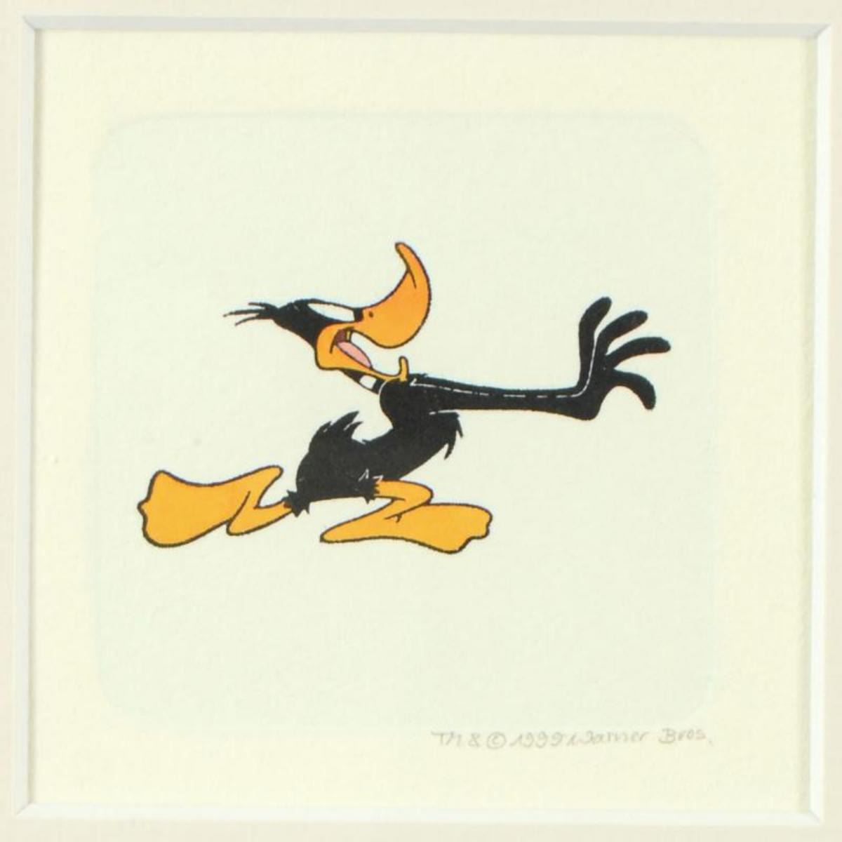 "Daffy Duck (Running)" is a limited edition etching on paper with hand-tinted coloring from Warner Bros, numbered and dated 1999. This piece comes framed. Measures approx. 9" x 9" (with frame), 2.5" x 1.5" (image). Reference #: 235704.