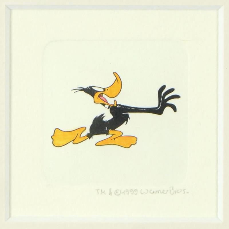 "Daffy Duck (Running)" is a limited edition etching on paper with hand-tinted coloring from Warner Bros, numbered and dated 1999. This piece comes framed. Measures approx. 9" x 9" (with frame), 1" x 2" (image).