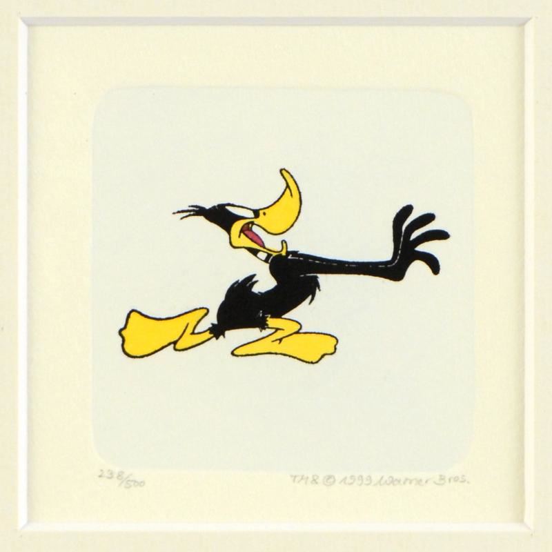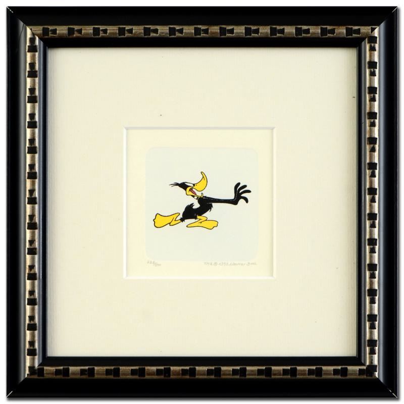 "Daffy Duck (Running)" is a limited edition etching on paper with hand-tinted coloring from Warner Bros. (dated 1999) and numbered! This piece comes framed. Measures approx. 9" x 9" (with frame), 2.5" x 1.5" (image).
