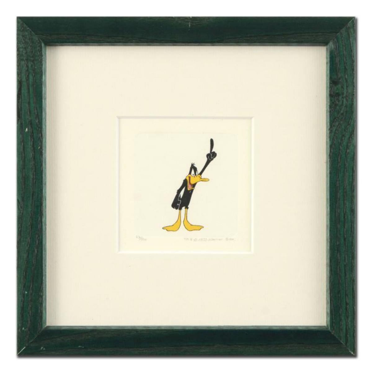 "Daffy Duck (With Hand Up)" is a limited edition etching on paper with hand-tinted coloring from Warner Bros, numbered and dated 1999. This piece comes framed. Measures approx. 8.5" x 8.5" (with frame), 1" x 2.5" (image). Reference #: 221020.